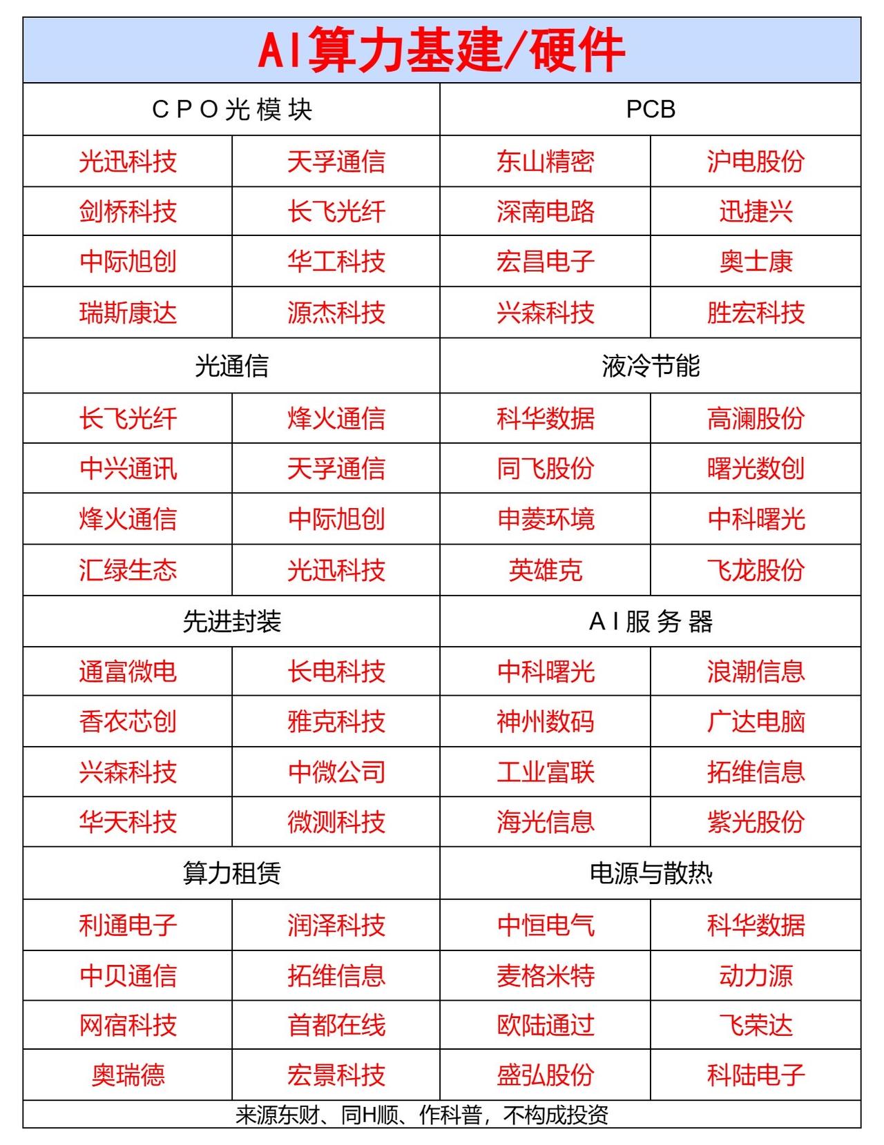 算力供应链核心公司: 1、算力芯片:海光信息,寒武纪,景嘉微,龙芯中科 2、服务