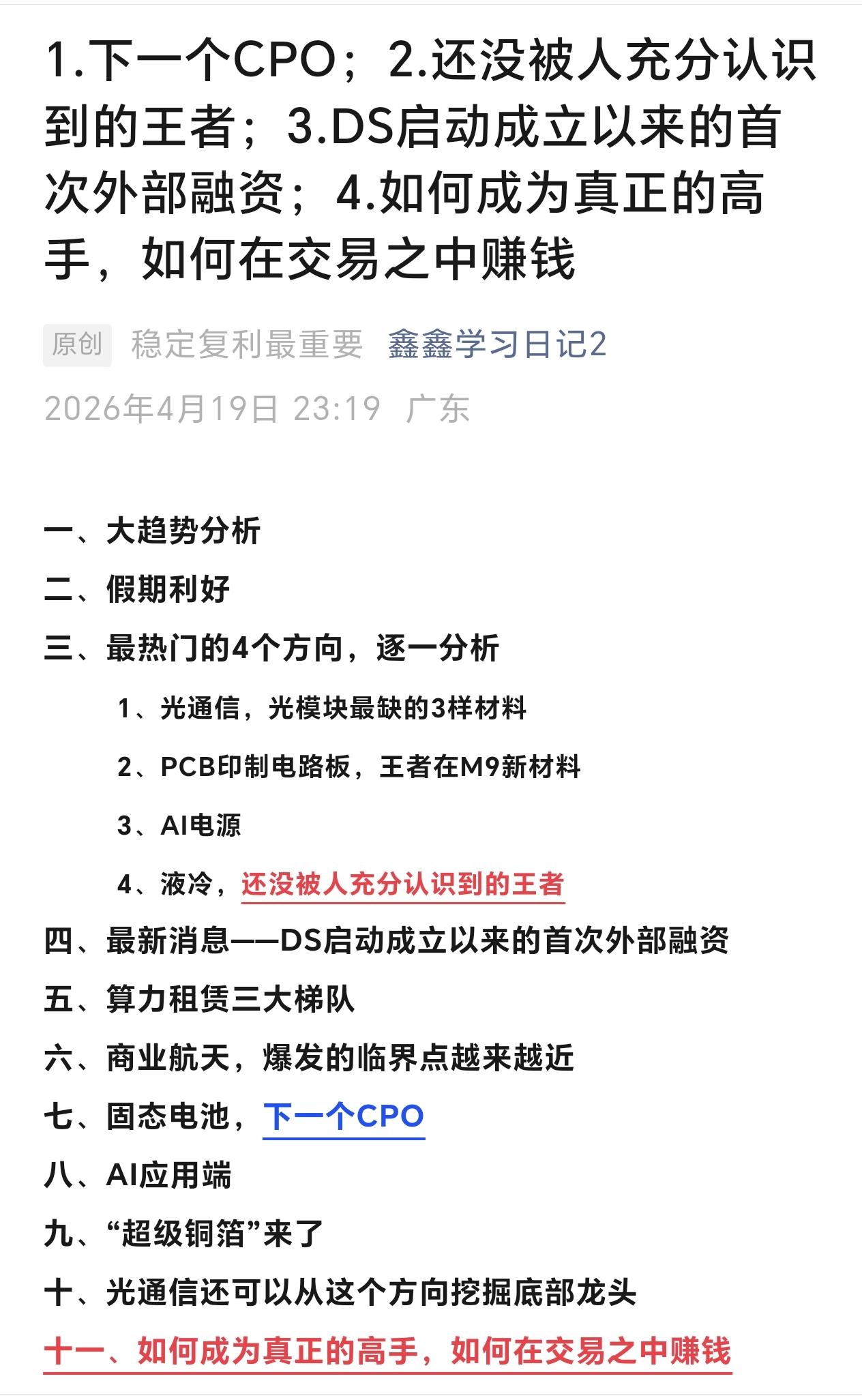 一、大趋势分析 二、假期利好 三、最热门的4个方向,逐一分析 1、光通信,光模块