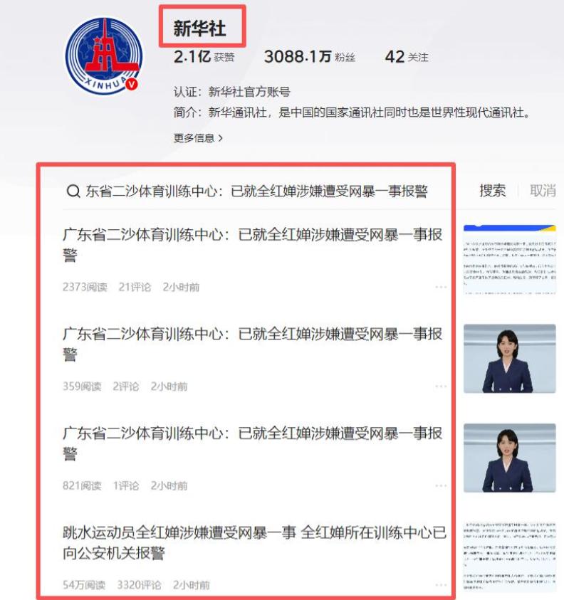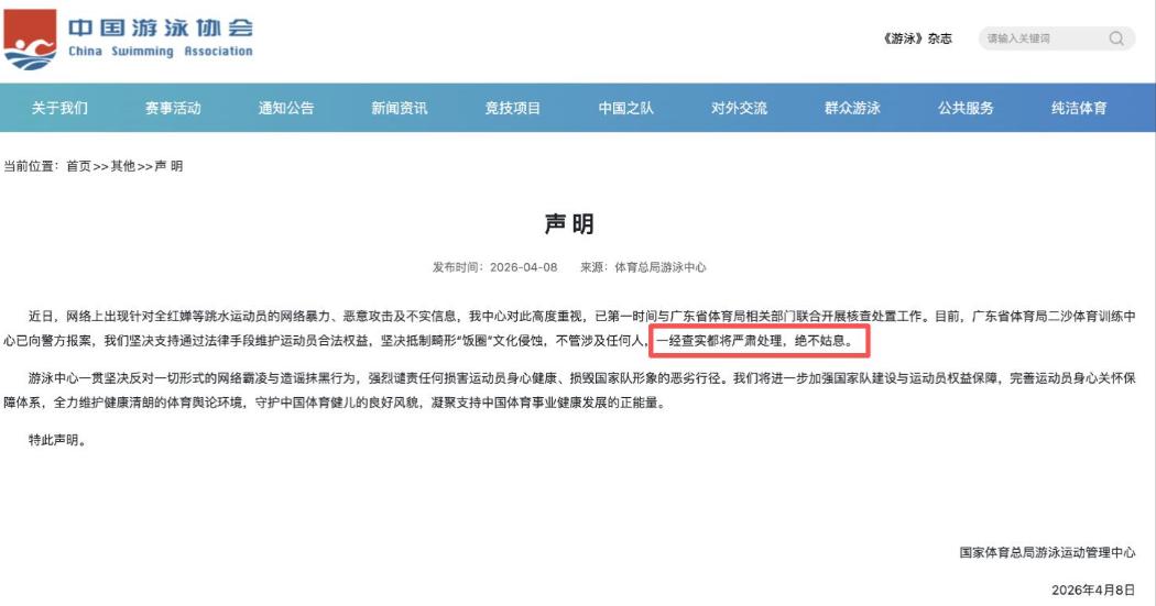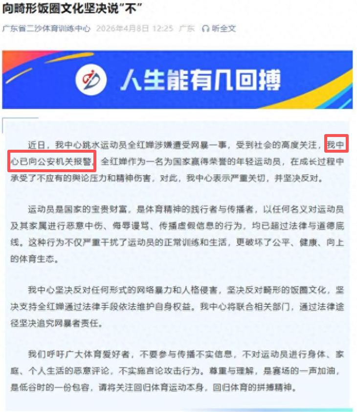 “近日,网络上出现针对全红婵等洗水运动员的网络暴力、恶意攻击及不实信息,我中心对此高度重视,已第一时间与广东曾体育局相关部门联合开展核查处置工作。目前,广东省体育局二沙体育训练中心已向警方报案,我们坚决支持通过法律手段维护运动员合法权益,坚决抵制畸形‘饭圈’文化侵蚀,不管涉及任何人,一经查实都将严肃处理,绝不姑息。”