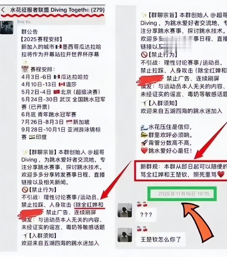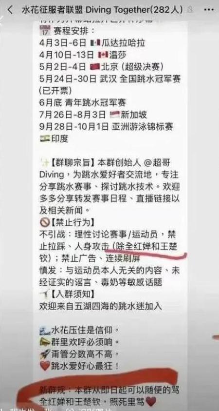 并且他们这个群的管理员并不是不明白不能对运动员进行不好的行为,明确禁止群友对运动员进行人身攻击,但是后面又加了个括号,说全红婵和王楚钦除外。