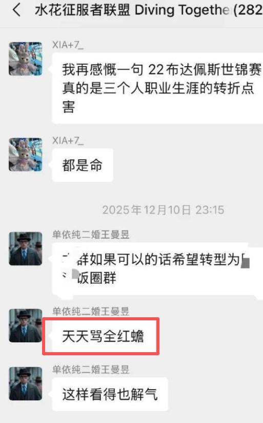 如今的消息是扒出了一个将近300人的社交平台群聊,从这个群聊的标题就能看得出来是专门聊跳水方面的事情的。