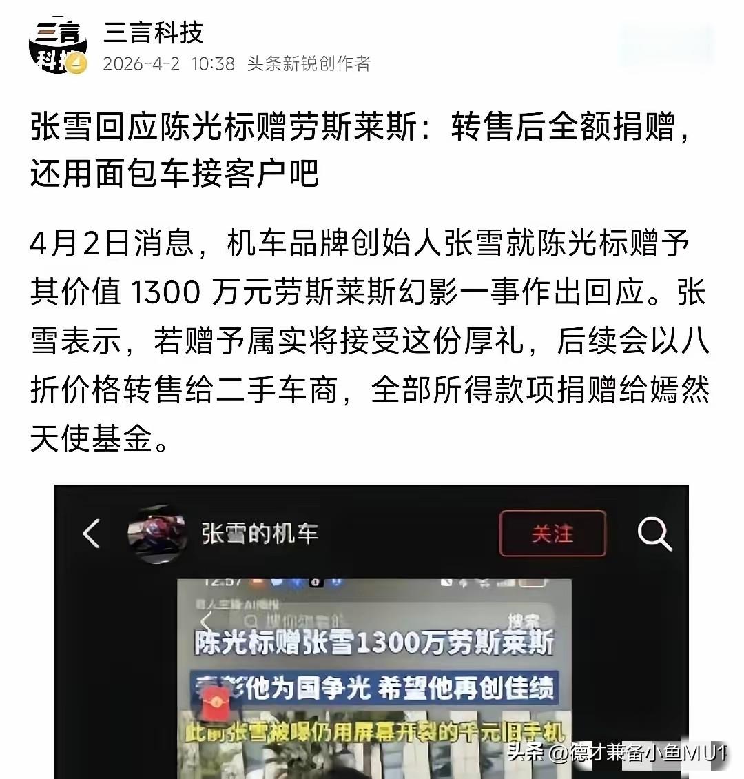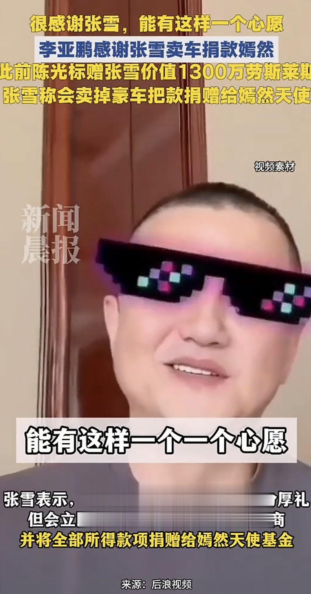 这还没完,张雪接下来的举动堪称一绝。她接着表示,收下车子后不会开,会直接找二手车行八折卖掉,然后把卖车所得的钱全部捐给李亚鹏的嫣然天使基金用于慈善。这番话让陈光标措手不及,当场愣住。想必他原本只想搞个高调慈善,博个好名声,没料到张雪如此干脆,还把事情引到了公益捐款上。