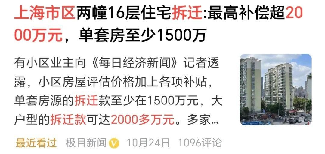 深圳某两栋18层老宅拆迁:单套补偿最低1600万元,最高突破2200万元。有业主透露,折算下来每平方米补偿高达18.2万元。这笔钱包含房屋价值、装修补贴、搬迁安置等多项费用,堪称“一站式财富包”。