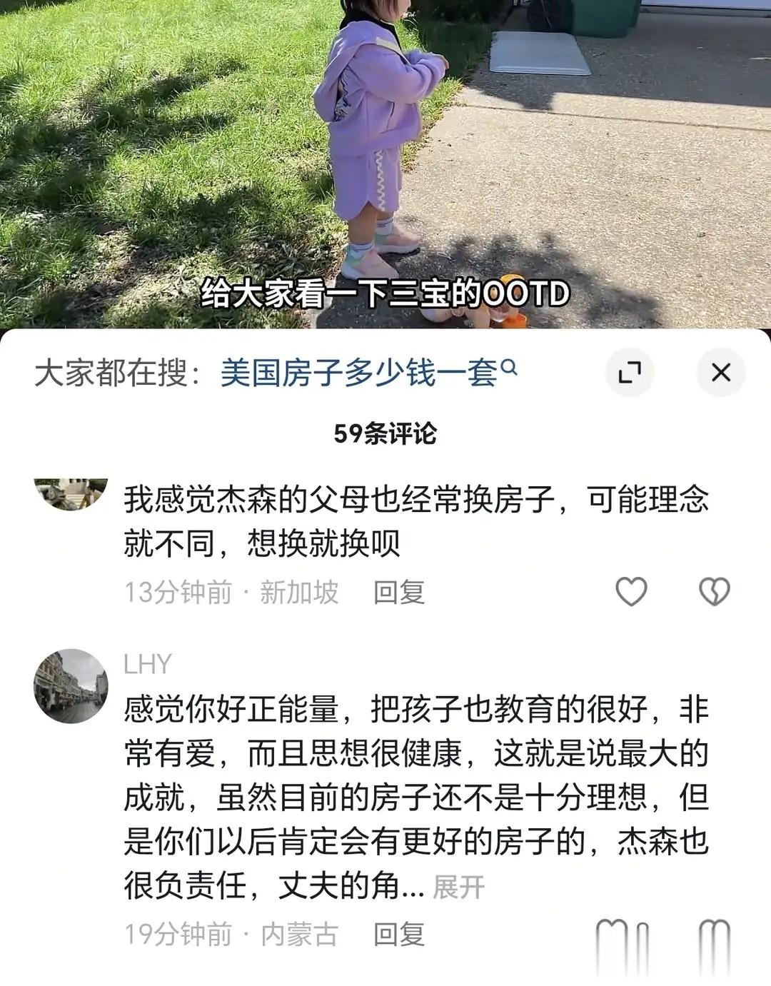 一套是小房子,只图一个「先落地」,后来小儿子要出生,她咬牙换了现在这套大一些的,好让妈妈来美国照顾月子时有地方住,那是 2 年前,她用手机拍下新房里的空厅,语气兴奋,网友说她「逆天改命」。