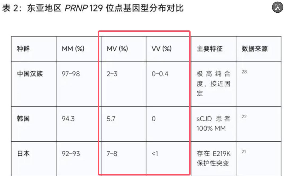 关键信息在这里:M/V杂合子对朊病毒疾病(比如库鲁病、散发性克雅氏病)有明显的保护作用。 换句话说,携带M/V杂合子的人,吃了可能含朊病毒的人肉或脑组织之后,发病的概率比M/M纯合子低得多。