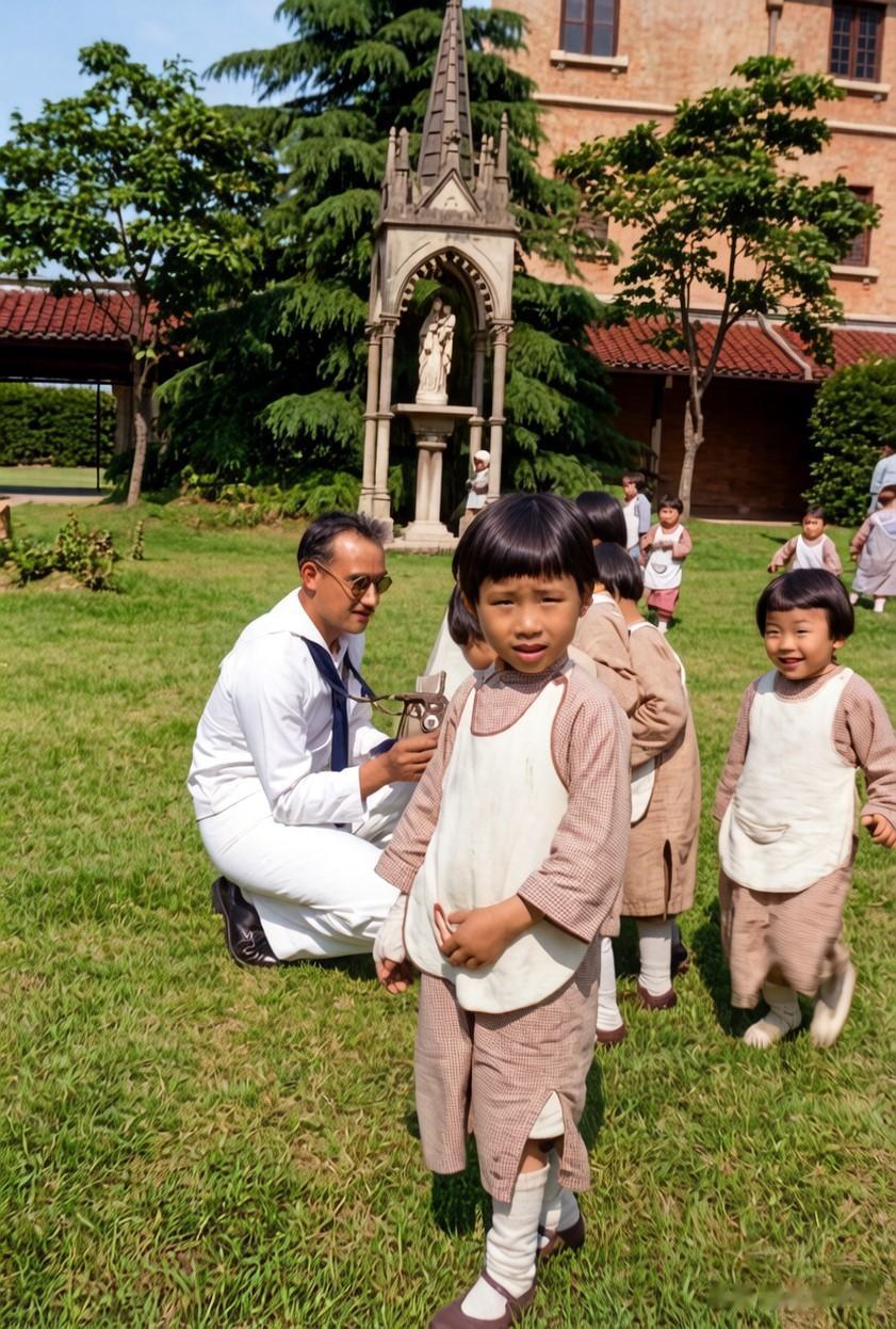 在青岛一所女子小学校内,一名美国水兵正在和一群小女孩互动交流。女孩子们穿着统一的服装,剪着同样的发型。从后面带有尖顶的建筑和圣母像看,这是一所教会学校。