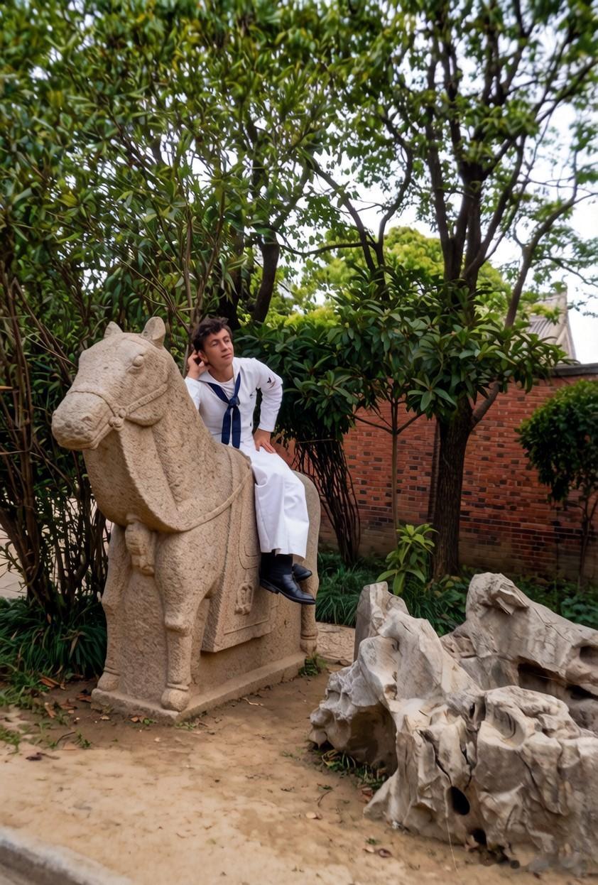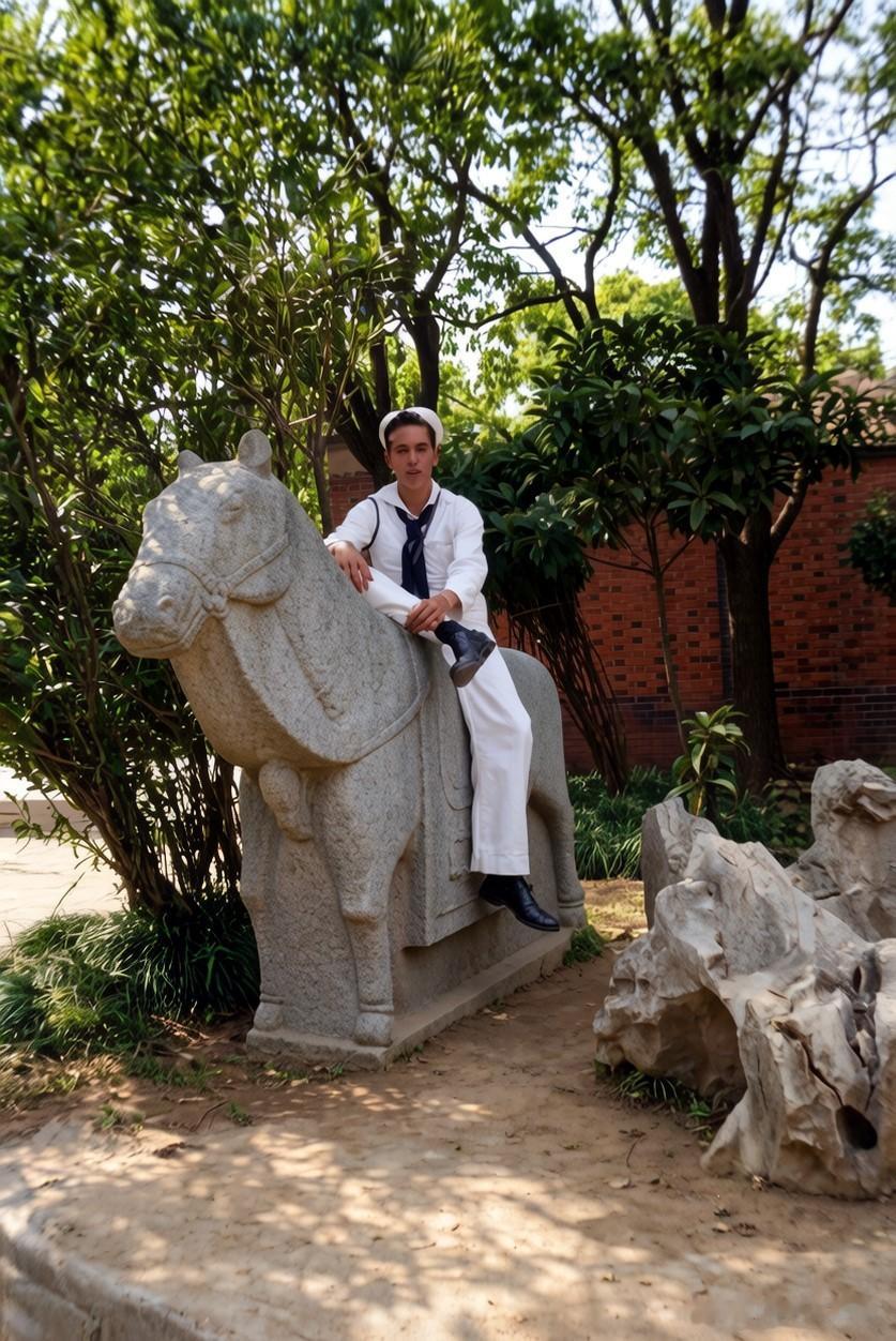 样子,这名水兵很喜欢这座石马雕像,坐在石马背上拍摄了第二张照片,可能真得把它当成了一座文物了。也许正因为是一座仿古摆设,现在已不找不见其踪影了。