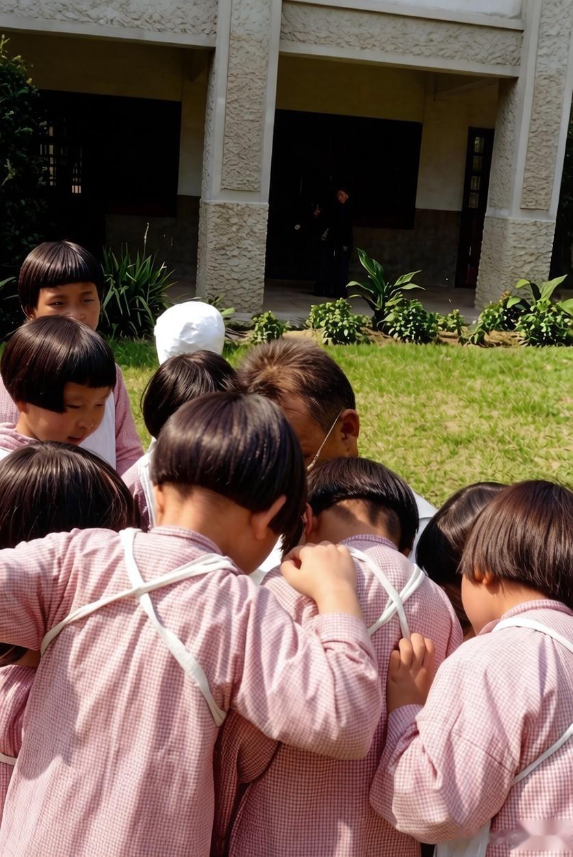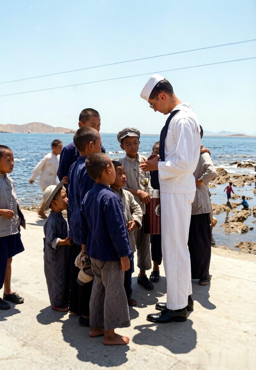 一群孩子正围着一名水兵,看他正在摆弄手里的东西。在孩子中间,有一个戴软檐帽的少年,手里捧着的保温桶看上去很高级。