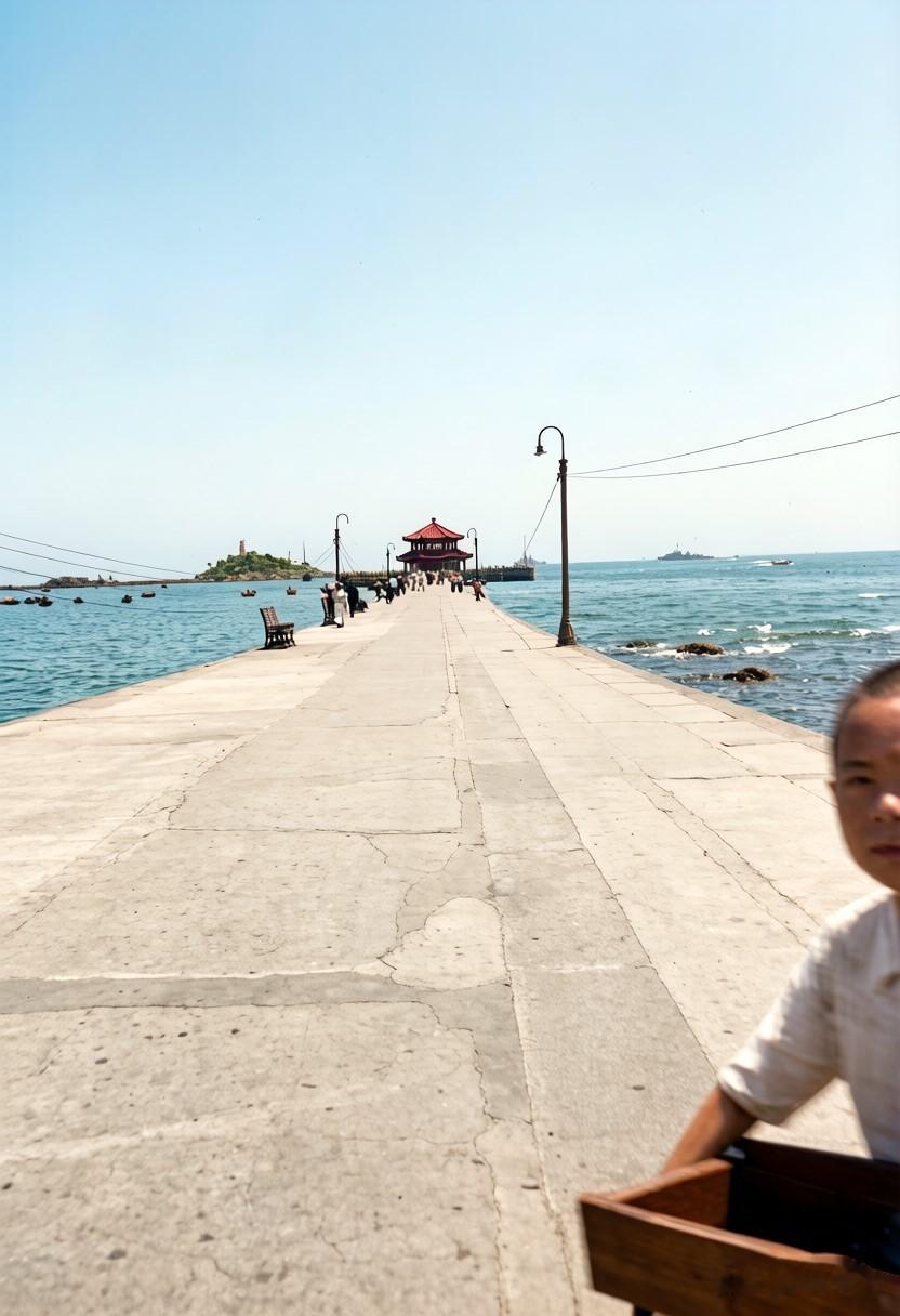 这是当年的青岛栈桥,桥上还没有栏杆,但长堤边安装有长椅供游客休息看风景。画面近景,是一个抱着木箱子的小男孩,可惜只露出半张脸。