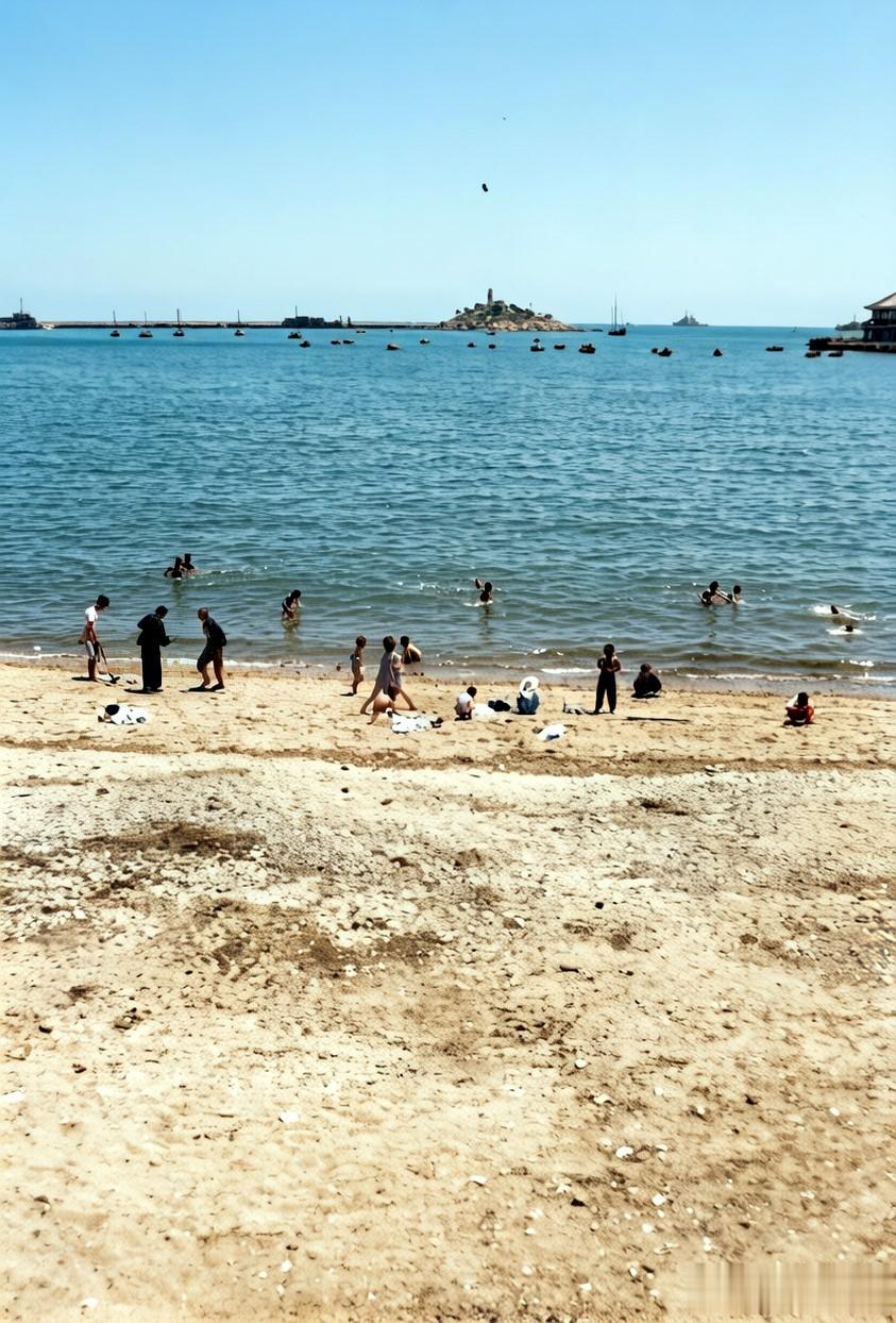 站在栈桥附近的堤坝上向远处眺望,湛蓝的海面上舟船点点。不远处的沙滩上,有的孩子在岸上玩沙子,还有的在海中戏水。