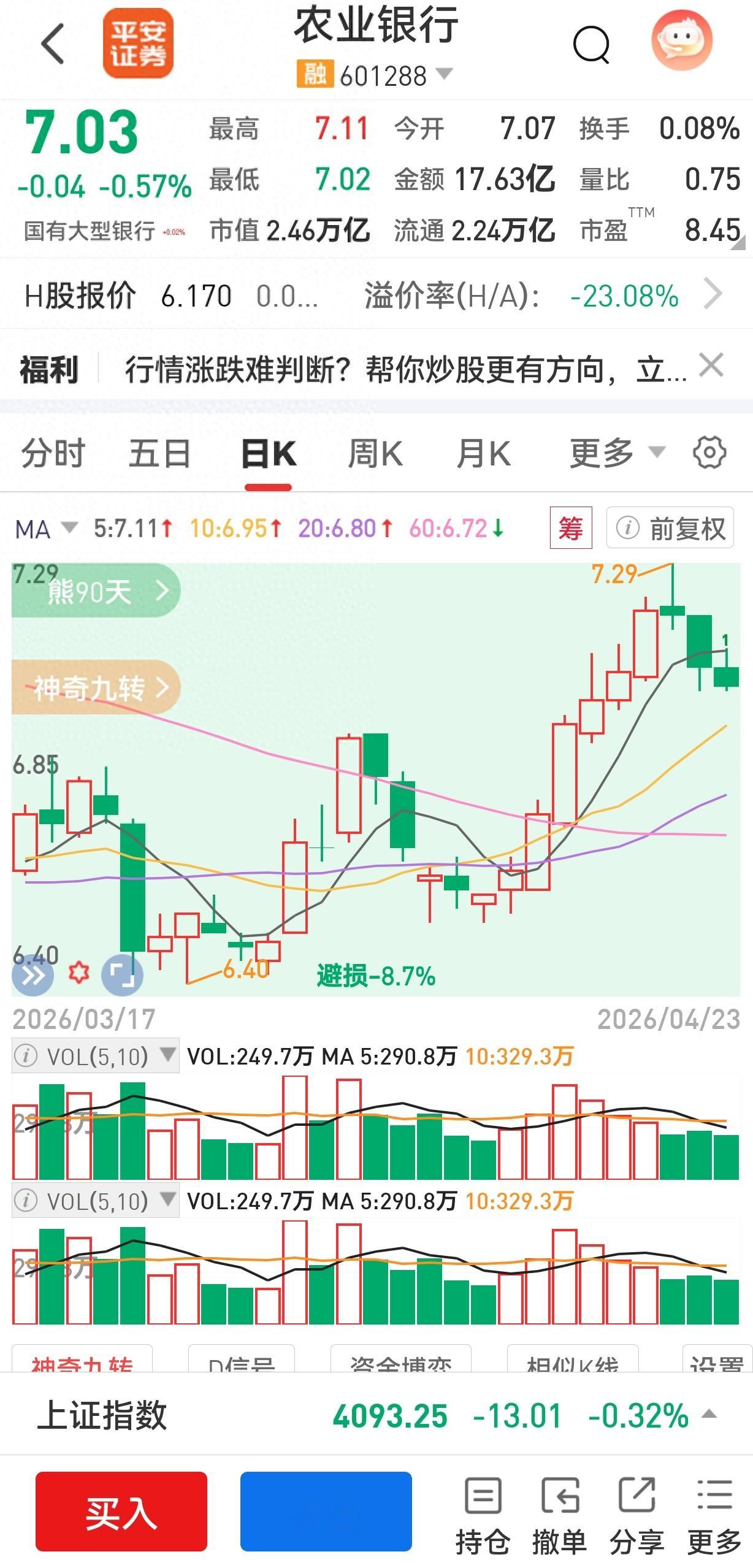 现在不少人慌了:银行股本来就没题材股热闹,现在还出现死叉信号,是不是要赶紧离场?我倒觉得,别被短期的技术信号乱了心神!股市里没有永远上涨的标的,哪怕是农行这种稳健的蓝筹股,短期的调整太正常了。