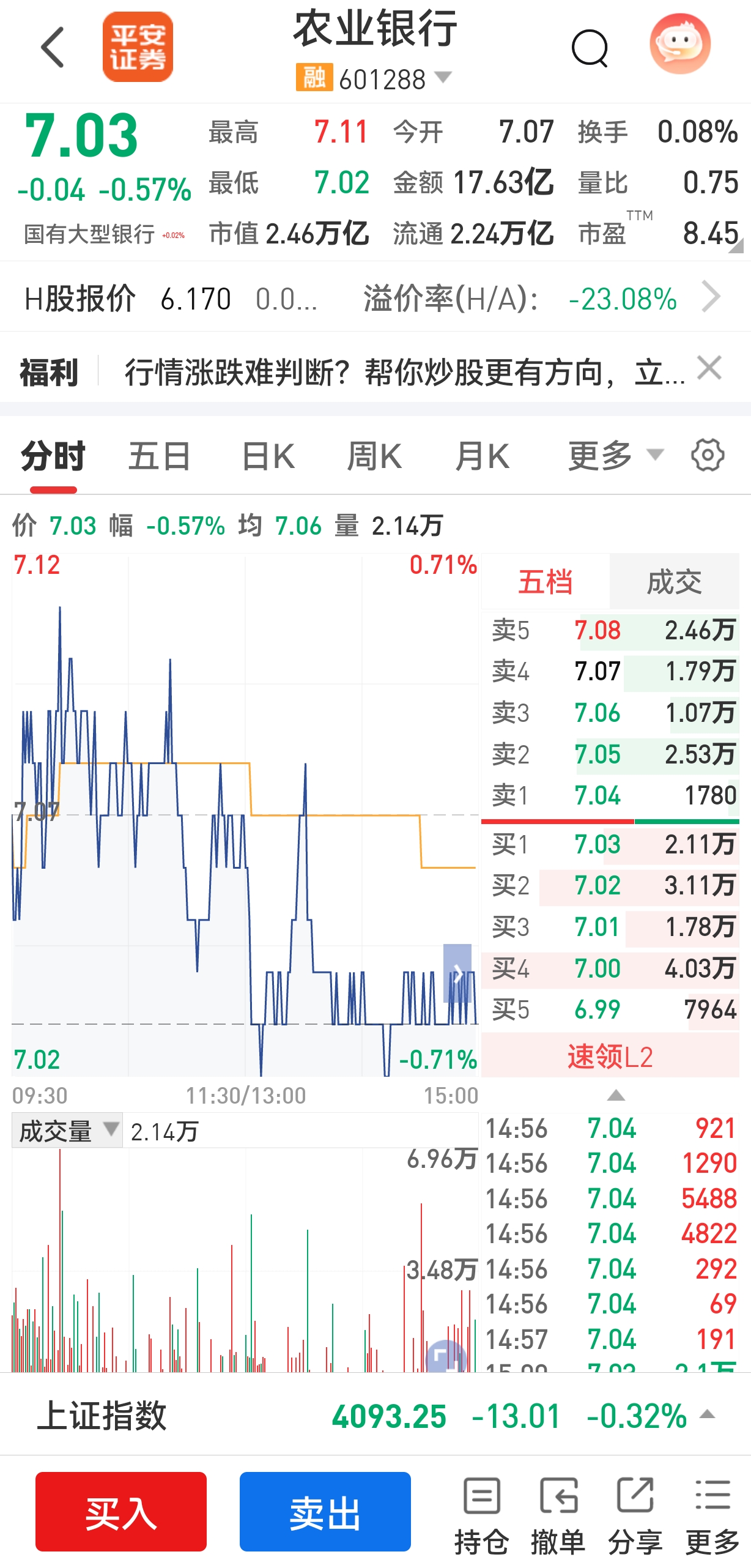 今天收盘,农业银行股价稳稳落在7.03元,当天跌了0.57%,成交额有17.63亿,但换手率才0.08%。作为市值超2.46万亿的国有大行,它没出现大起大落,早盘冲高到7.11元,之后就一路走弱,全天都在均价线下方徘徊,尾盘还在低位徘徊,不少持仓的朋友心里都犯嘀咕:这波调整到底要不要跑?