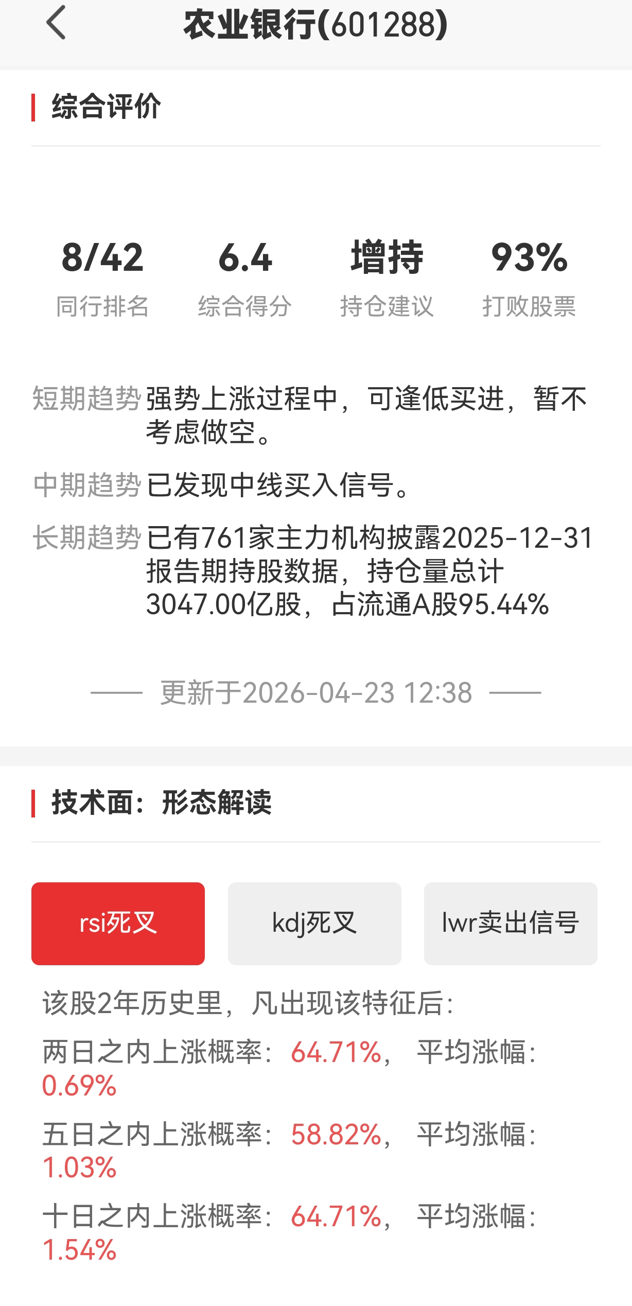 但咱得清醒,农行的底气从来没断过!761家主力机构持有3047亿股,占流通A股的95.44%,筹码锁得死死的,散户浮筹少得可怜。这就意味着,就算短期走势走弱,股价也不可能大幅下挫,妥妥的“安全垫”摆在那。再加上8.45的低市盈率、稳定的高股息属性,它一直是A股里的“压舱石”,这是没法否认的事实。