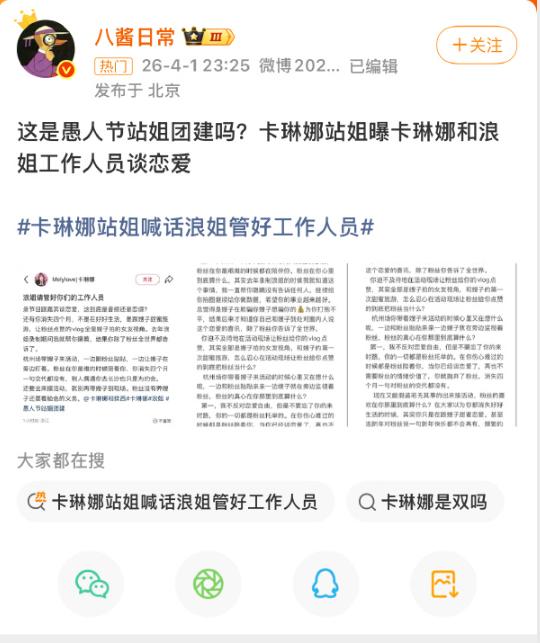 事情的起因似乎并不简单。作为一位在二次元圈和泛娱乐圈都拥有极高人气的coser,卡琳娜凭借其出众的外形条件和温柔的性格圈粉无数,她的每一次公开活动都能吸引大量粉丝到场支持。而此次她参与《浪姐》相关录制,本应是让粉丝们欣喜若狂的事情,然而站姐的这番喊话却揭开了光鲜表象下令人不快的另一面。据站姐的描述,在卡琳娜参与节目相关活动的过程中,现场的工作人员出现了诸多不当行为,这些行为不仅影响了卡琳娜的正常工作状态,更让远道而来支持偶像的粉丝们感到心寒。