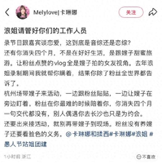 站姐的发声措辞相当直接,没有使用任何含糊的暗示,而是明确地将矛头指向了《浪姐》节目组的工作人员。她没有选择私下沟通解决,而是将问题公开化,这种做法的背后显然积累了相当多的不满情绪。从字里行间可以感受到,站姐认为节目组在人员管理和现场把控上存在严重疏漏,工作人员的不专业行为已经超出了可以容忍的范畴。这种公开喊话的方式,在粉丝圈层中并不常见,通常只有在多次沟通无果后,站姐才会选择用这种近乎最后通牒的方式来表达诉求。