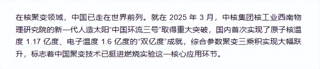2025年3月中核集团对外宣布,中国环流三号装置取得了关键性的技术突破,内部等离子体的电流运行水平又创新高。