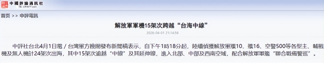【信源:中国评论通讯社2026-4-1解放军军机15架次跨越“台海中线”
