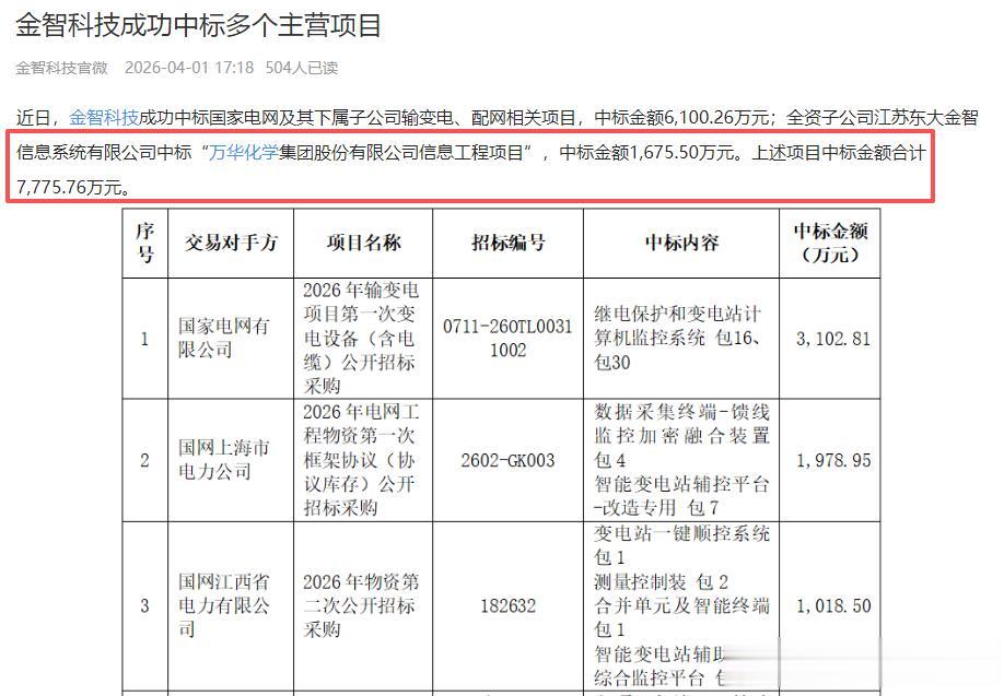 第五家:金智科技,公司在输变电,配网项目连续中标,总金额达7700多万。国内电气自动化设备行业龙头企业,国内电气自动化设备行业龙头企。公司股价10元左右,市值40多亿。