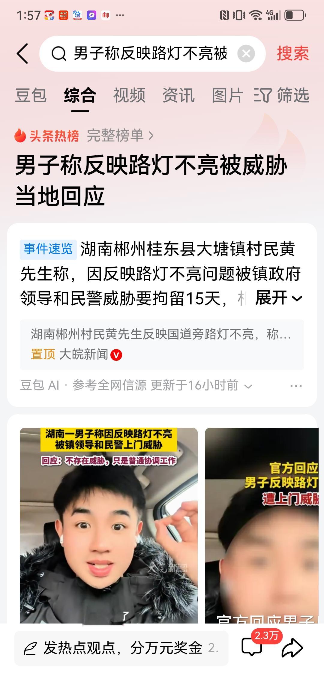 一则看似普通的民生投诉,近日在湖南郴州桂东县大塘镇引发了一场不小的风波。村民黄先生春节回乡时发现,106国道旁有50多个路灯不亮,沙田镇一段1公里长的隧道路灯更是常年失修。出于对家乡公共设施安全的担忧,他拍摄视频发布到网上,很快获得高达22万的点赞。然而,事情并没有朝着“问题被迅速解决”的方向发展。镇政府一位郭姓领导随后带领村干部、镇工作人员及派出所民警上门,要求黄先生删除视频。黄先生声称,自己在这一过程中遭到“威胁拘留15天”。当地有关部门事后回应称,不存在威胁行为,警方也表示从未采取任何拘留措施。事件最终被定性为一场“误会”,但舆论已经发酵。