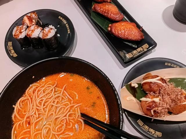 我们点了拉面、寿司、鸡翅和章鱼丸子,这个店是传送带自动送餐,每次有食物传过来时,女儿都会特别兴奋,看着她的样子我也忍不住兴致好起来。