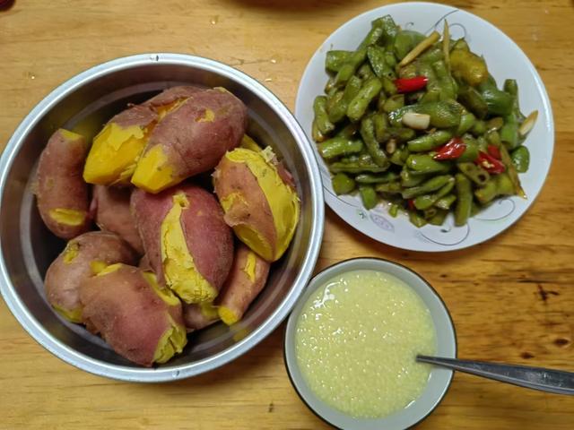 早餐吃了小米粥、红薯和毛豆。
