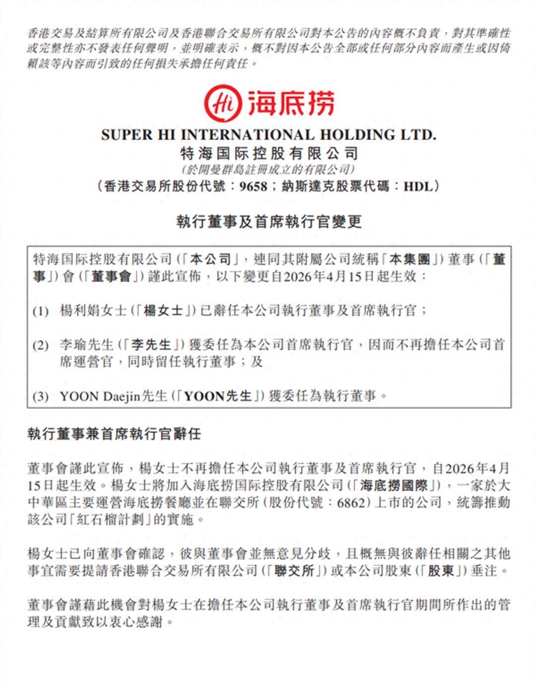 4月15日晚,一则公告震动餐饮圈。杨利娟辞任特海国际CEO,正式回归海底捞,全权执掌红石榴计划。