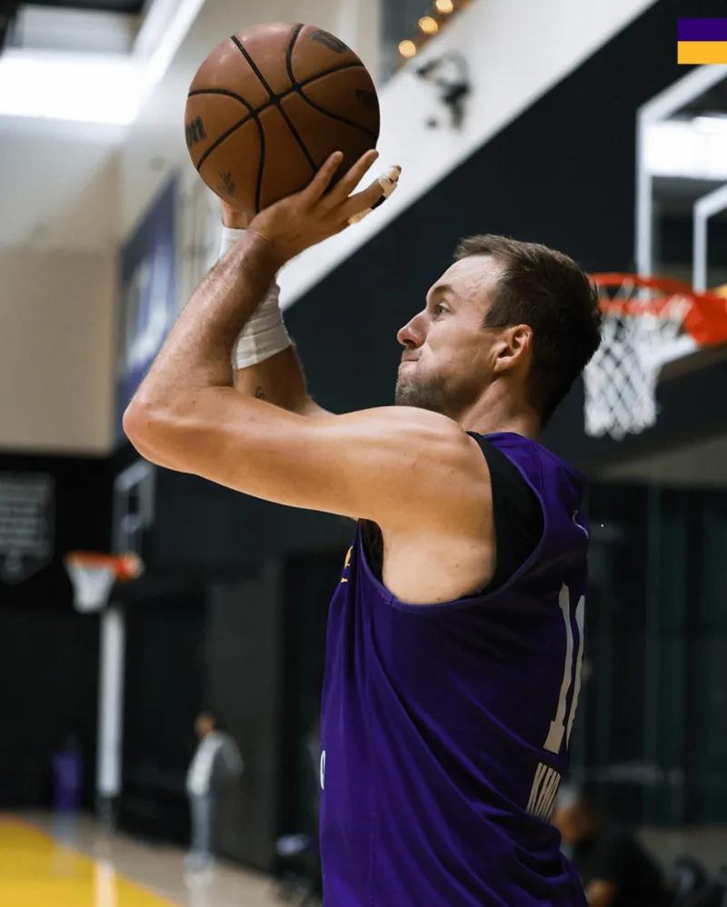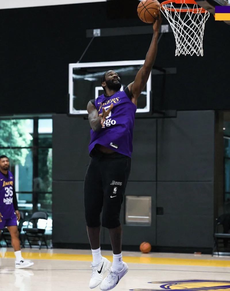 画面中,湖人队的训练场馆内气氛热烈且紧张。球员们全情投入,有的在进行投篮练习,篮球在空中划过一道道优美的弧线,精准地落入篮筐,展现出他们扎实的基本功;有的则在进行对抗训练,激烈的身体碰撞声不绝于耳,他们拼尽全力,每一个动作都充满了力量感。教练组也没有闲着,他们在场边密切关注着球员们的表现,不时地大声指导,给出专业的建议和战术安排。