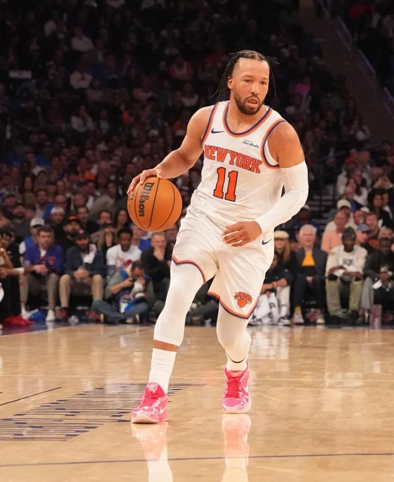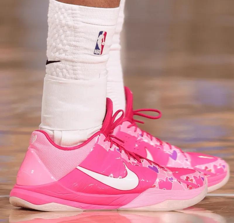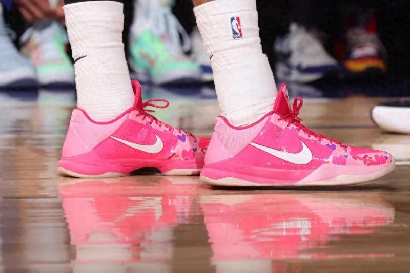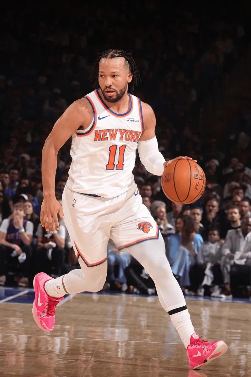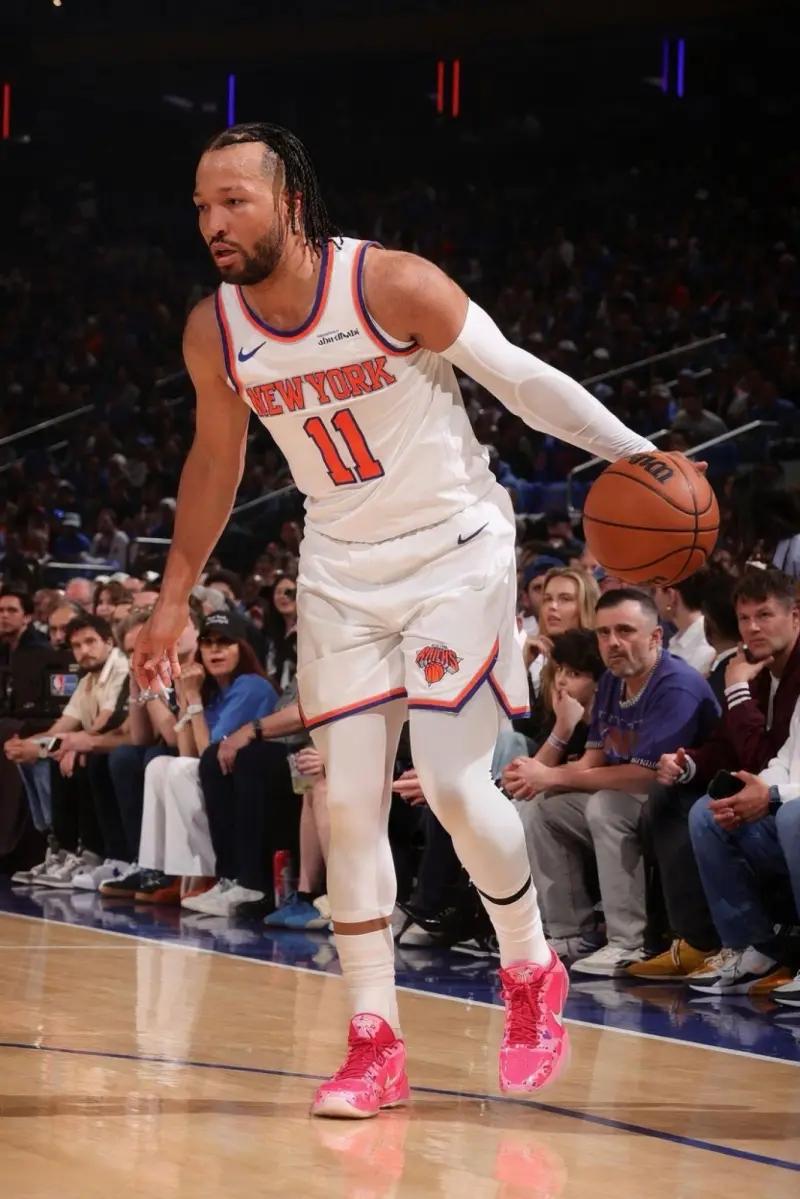 值得一提的是,在比赛中,布伦森上脚了个人专属的粉色Nike Kobe 5 Protro“Jordyn”PE战靴。这款战靴设计独特,粉色的外观十分亮眼,彰显了布伦森的个性。从篮球文化的角度来看,Kobe系列战靴一直以来都深受广大球迷和球员的喜爱。科比 - 布莱恩特作为篮球史上的传奇人物,他的战靴不仅在性能上有着卓越的表现,更承载着无数球迷的篮球梦想和情怀。布伦森选择这款战靴出战季后赛,也体现了他对科比的敬意以及对篮球精神的传承。
