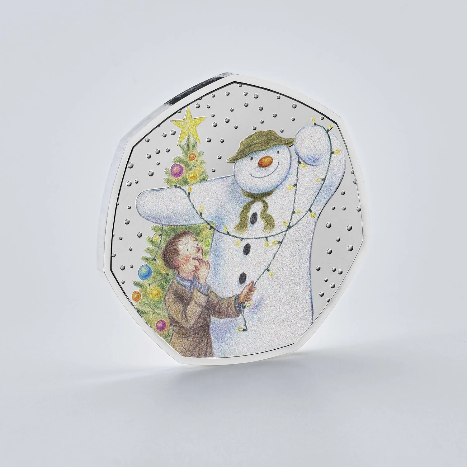 背景信息对许多人来说,《雪人》™是圣诞庆祝活动中受欢迎且熟悉的元素。今年,这位深受喜爱的节日角色再次现身,第八次登上英国官方圣诞50便士硬币。该收藏币系列首次发行于2018年,其灵感源自1978年出版、由雷蒙德·布里格斯(Raymond Briggs CBE)创作的同名书籍改编的26分钟动画电影。这部电影于1982年12月26日在英国首次播出。故事讲述了令人动容的友谊:小男孩詹姆斯在地板下发现了一个秘密盒子,盒子里有一顶帽子、一条围巾、几块煤和一个干瘪的橘子——一套堆雪人的材料!当天晚些时候,下雪了,詹姆斯堆了一个雪人。当晚午夜时分,雪人神奇地活了过来。男孩醒来后,和新朋友一起开启了一场奇妙的冒险,他们飞往北极,还意外遇见了身着红装的圣诞老人本人。