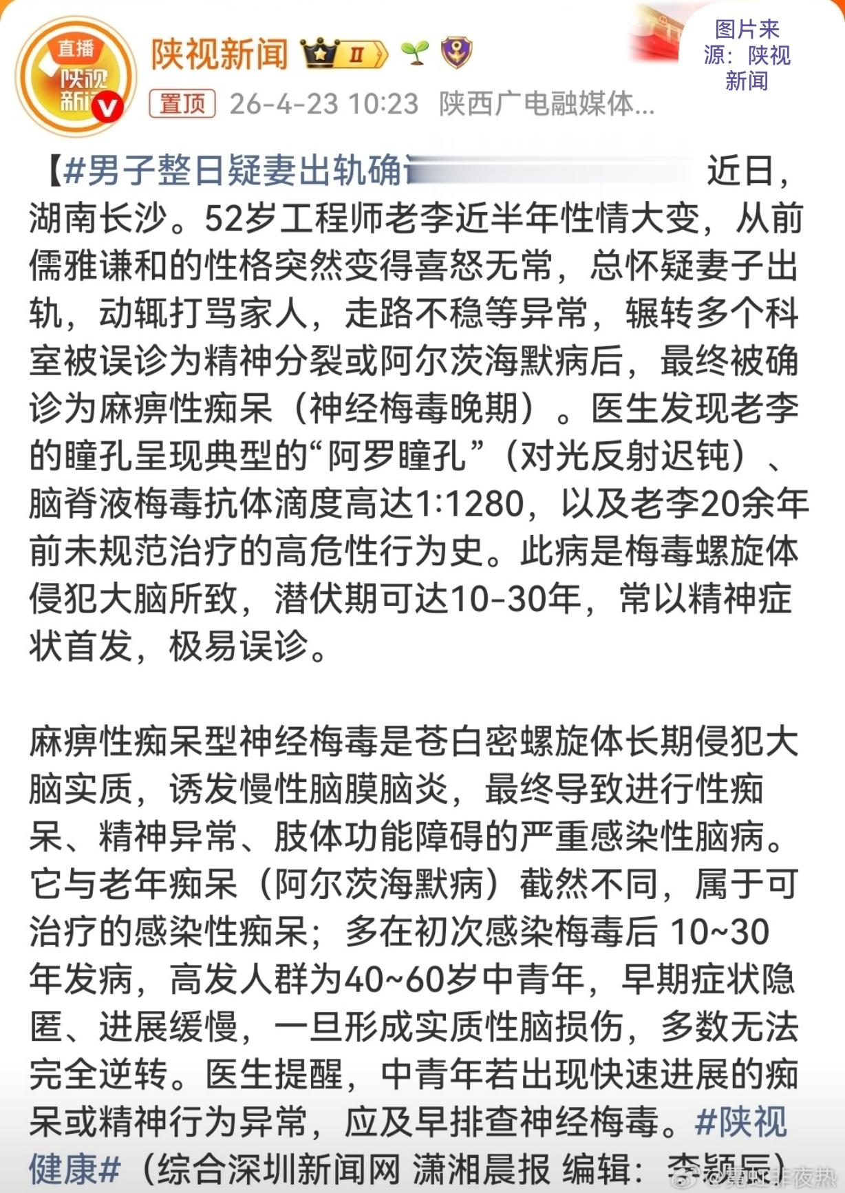 #男子疑妻出轨确诊神经梅毒晚期 #神经梅毒高发人群 #健康警示 #梅毒潜伏期风险
