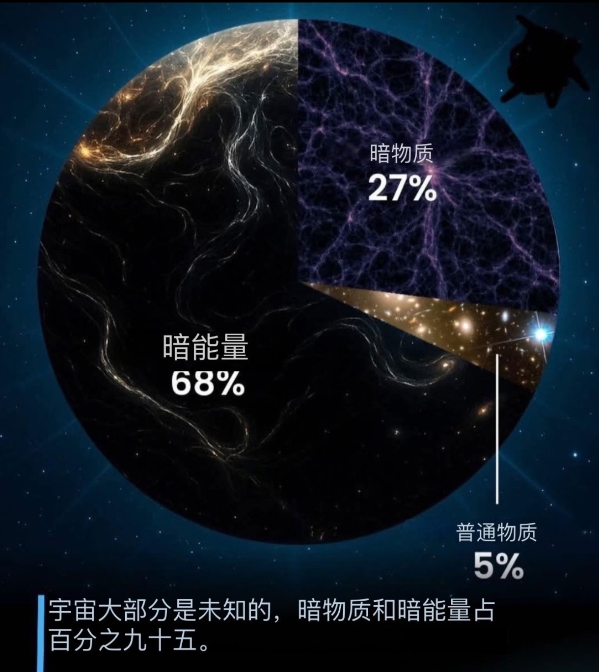 暗能量占据宇宙总能量的68%,是推动宇宙加速膨胀的神秘力量。