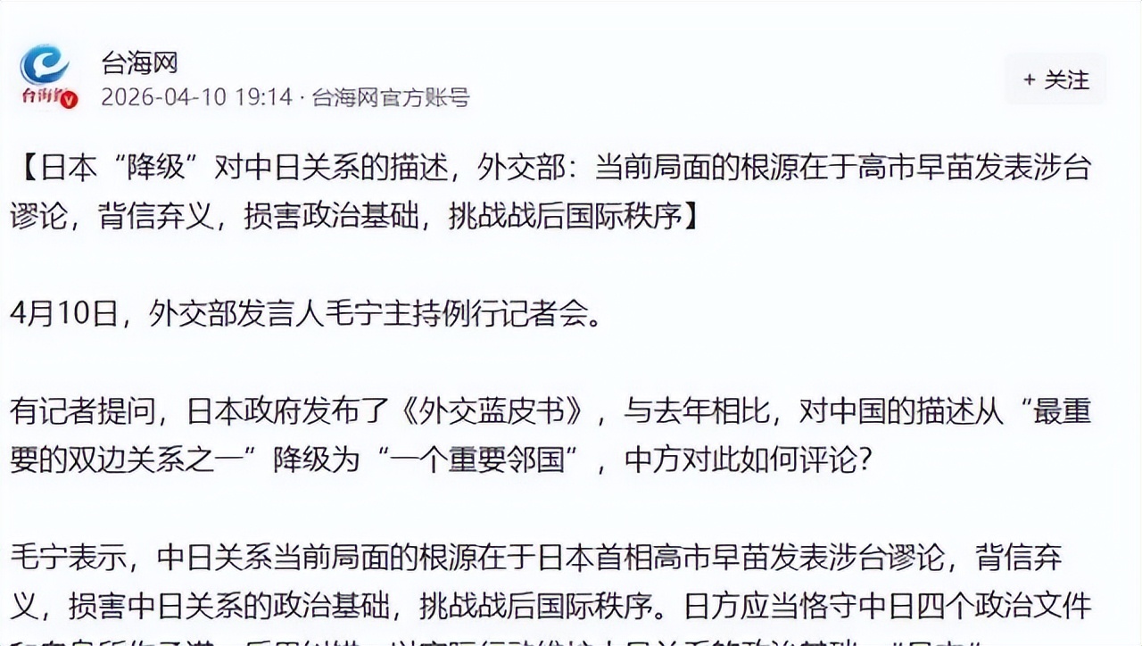 4月10日,日本政府发布年度《外交蓝皮书》,将中日关系的定位从沿用多年的"最重要的双边关系之一"降格为"重要邻国"。消息传开不到12小时,中日之间53条航线全面取消的消息铺天盖地而来。高市早苗至今对此不置一词。