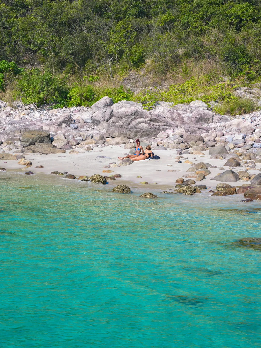沙滩细软,海水清澈,晒日光浴的人特别的chill