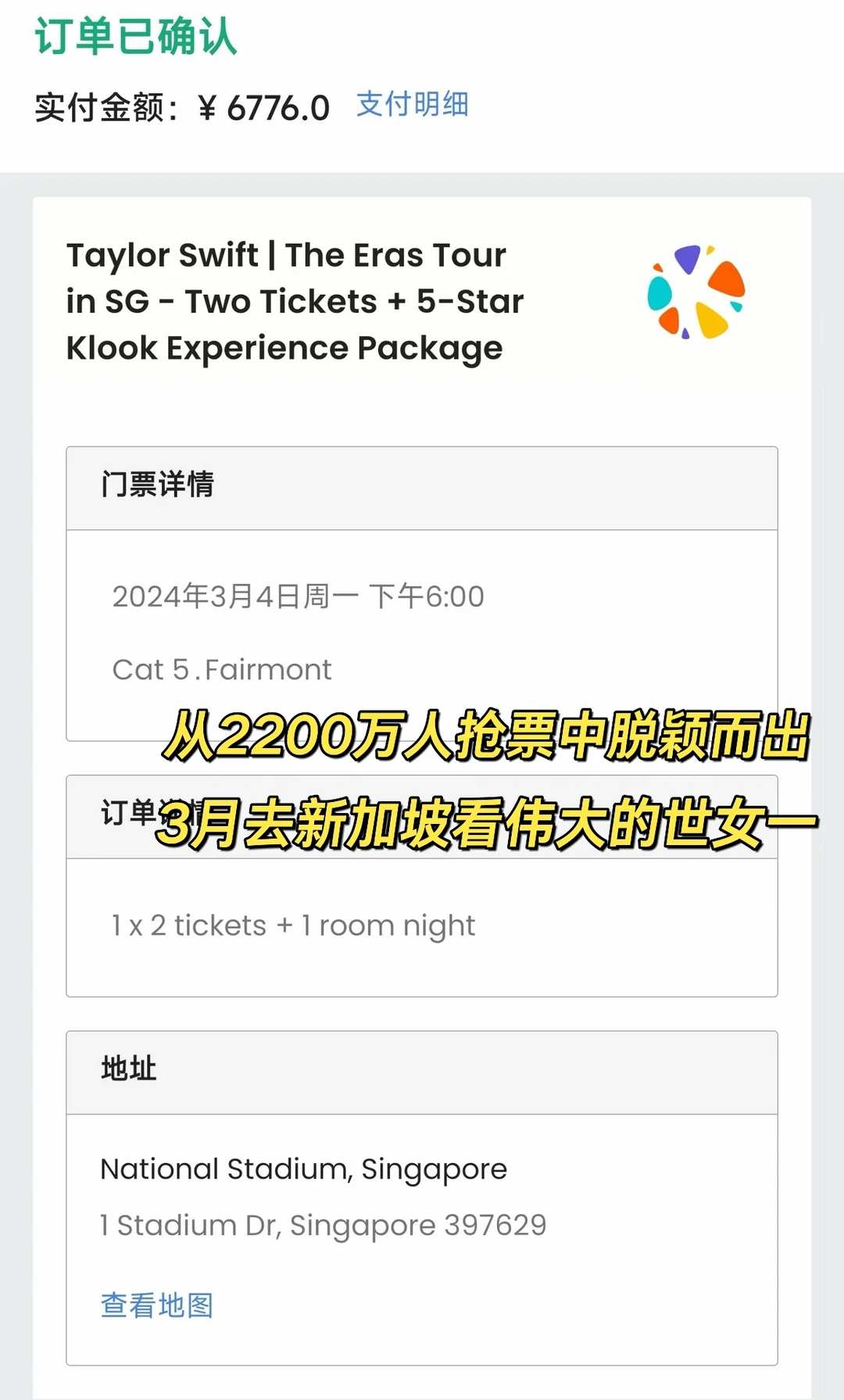 当然我肯定不会告诉你,我早就抢到了今年3月去新加坡看霉霉的时代巡演门票!