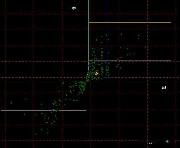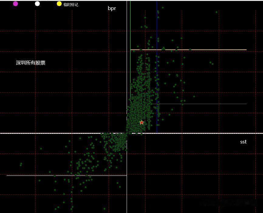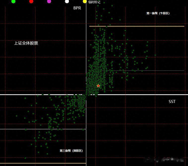 好了如果您明白了以上我说的这些,那么我们可以把所有的A股导入到这个以 SST(天)为横坐标,以BPR(格)为纵坐标的 坐标体系当中了,那么所有的涨的最好的暨大牛股肯定在第一象限右上位置;跌的最惨的暨大熊股肯定在第三象限左下角位置。于是整个强弱分布图就清清楚楚了。当股市处于终结底部那么肯定绝大多数股票在第3象限聚集着,第一象限少的可怜,反之当股市将第3象限的股票通过一波波上涨 摆脱了你设定的那根均线成为牛股 也就是第3象限资源挖掘殆尽时,那么资源枯竭 牛市终结大顶到了。(tips 我发布的视频里有动态展示 ,想深入的可以去搜我的视频)