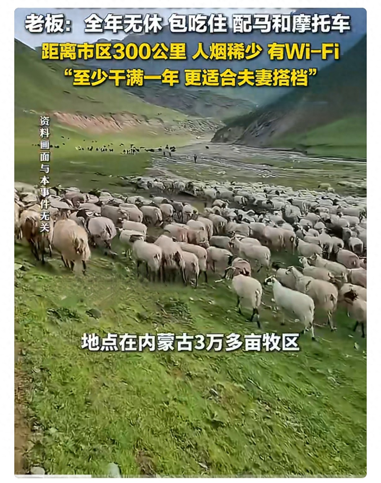 近日,内蒙古锡林浩特一则招聘启事刷爆网络:月薪1.6万招放羊人,包吃住有WiFi,听起来是不是让打工人瞬间心动?但看完招聘要求,不少网友直呼“这钱不好赚”!