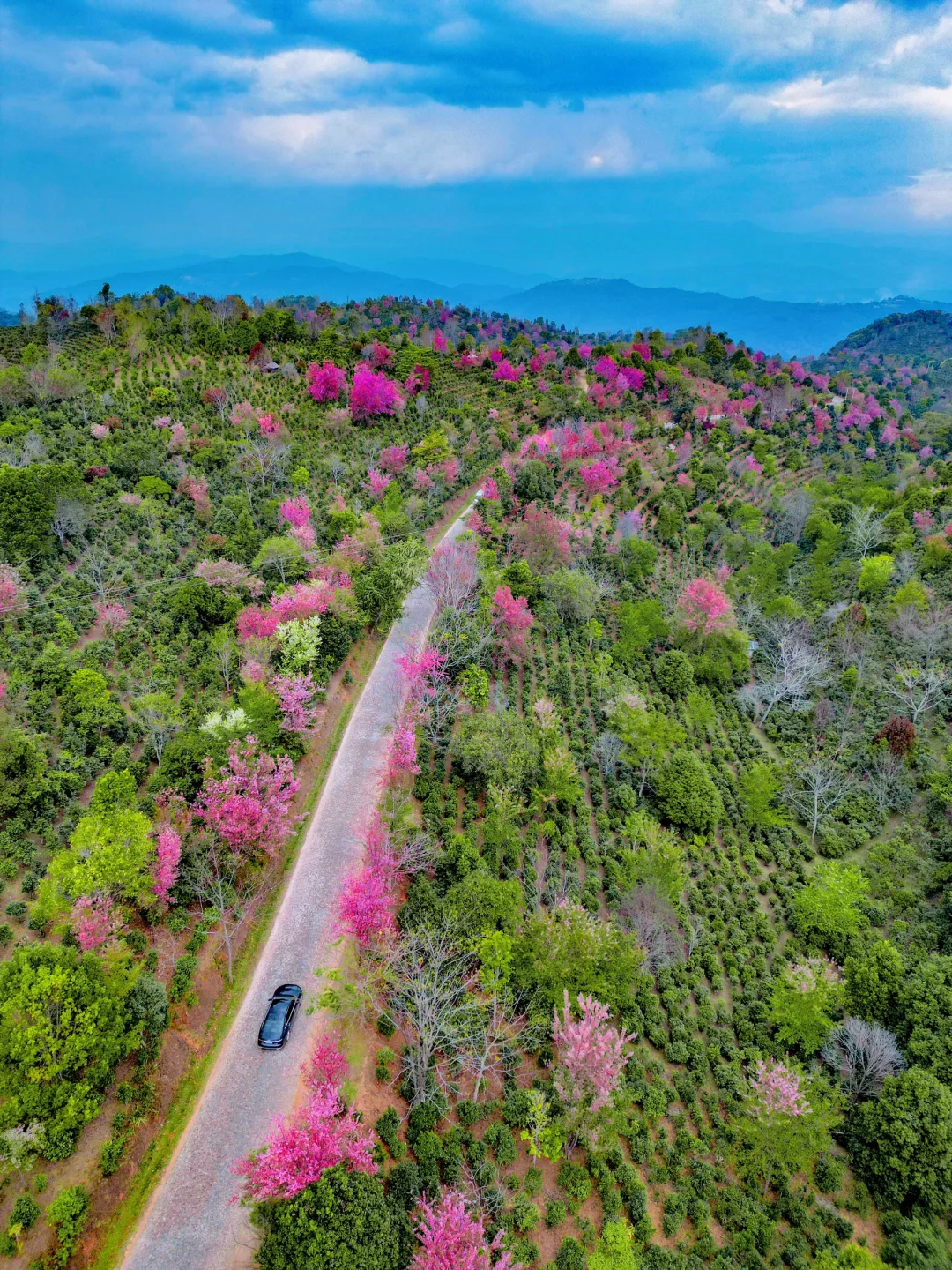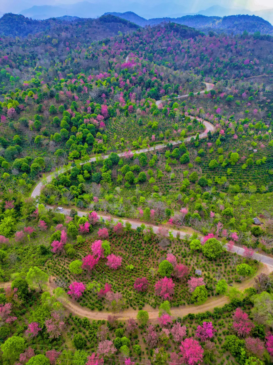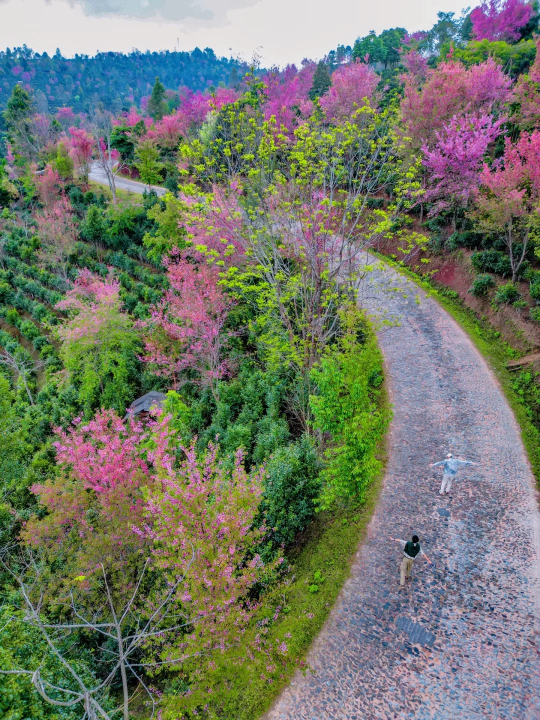 满山遍野的古茶林,密密麻麻的冬樱花