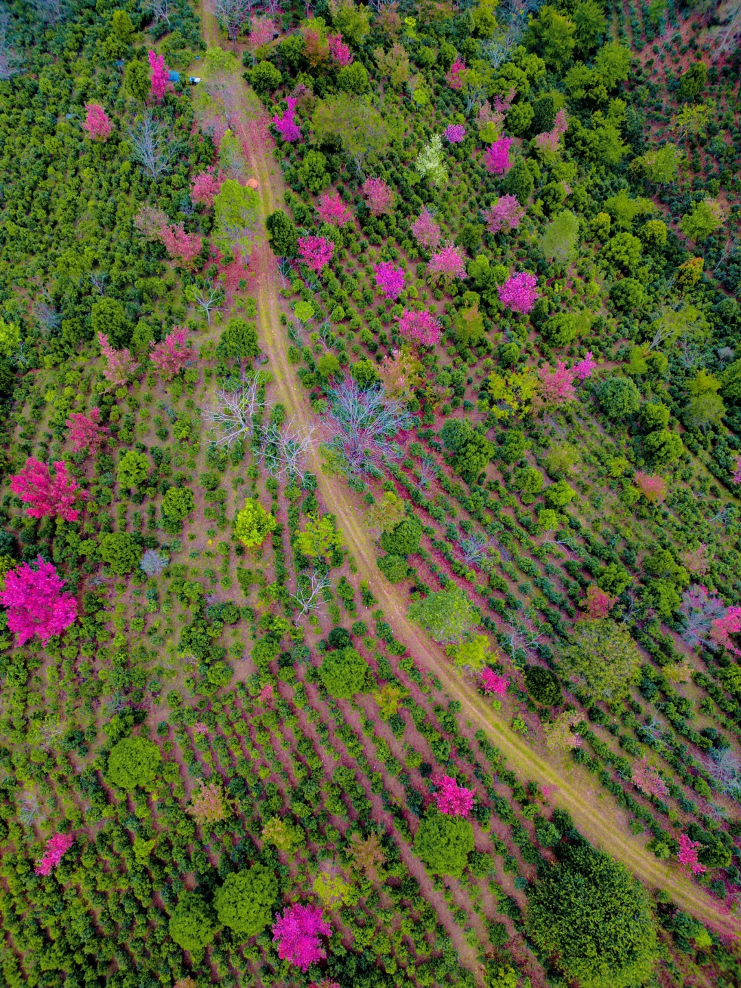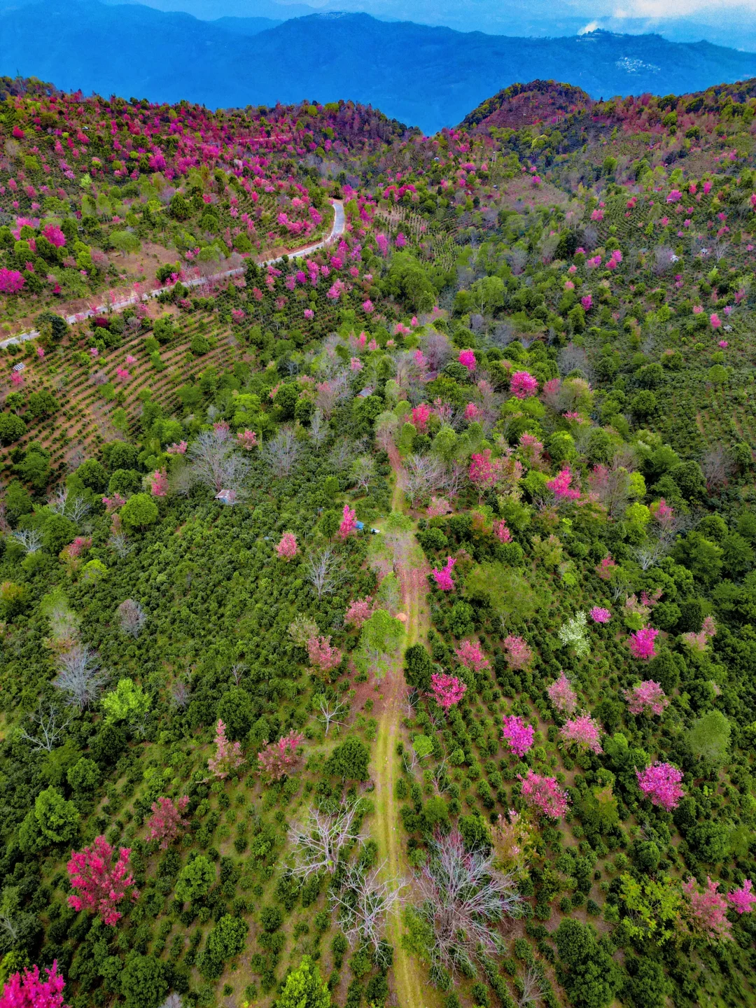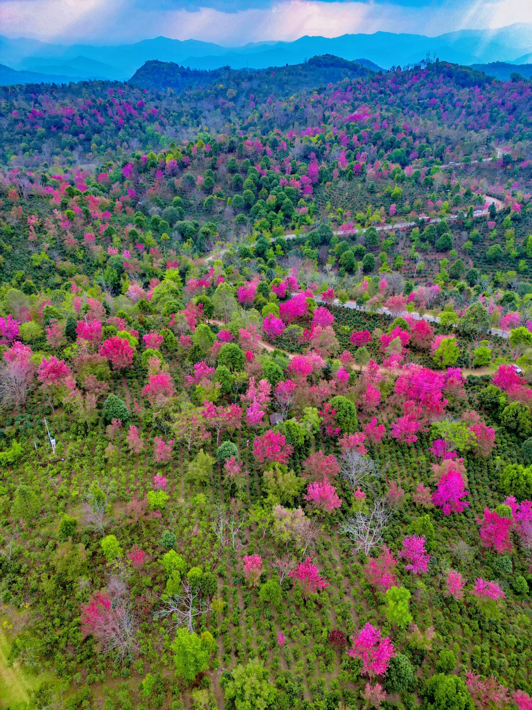 满山遍野的古茶林,密密麻麻的冬樱花