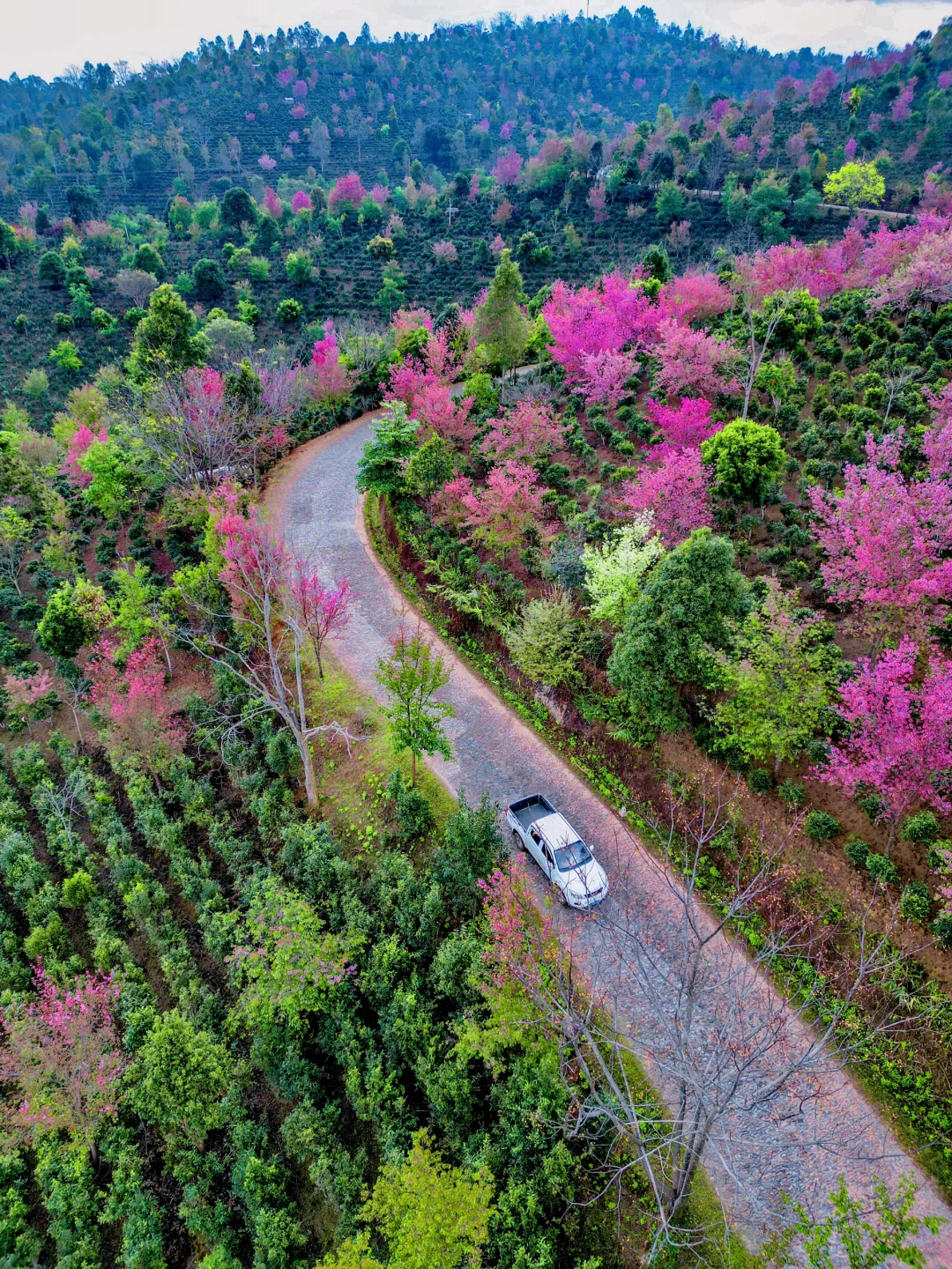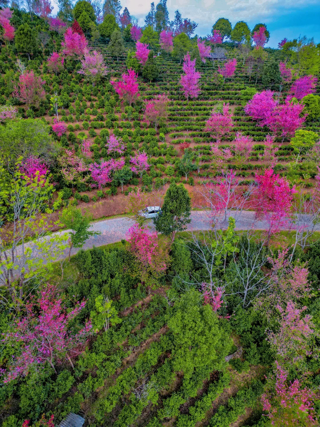 自驾盘旋在开满樱花的茶林小路上