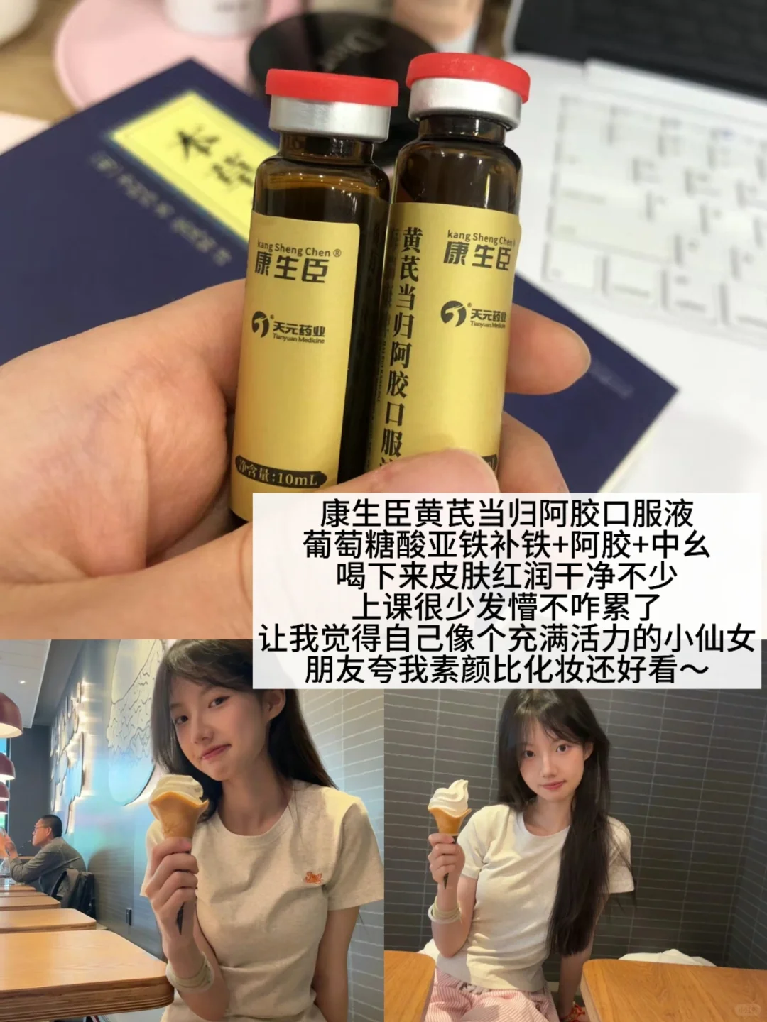 铁元素是血的生化之源,铁足血足脸才净。这个康生臣黄芪当归阿胶口服液是去看了中翳建议我喝的,里面有葡萄糖酸亚铁(补铁)+陈年阿胶+4种黄芪党参(本草纲目记载党参很适合体虚的)!坚持喝下来皮肤红润干净好多,上课很少发蒙不咋累了,开空调身上也不觉得凉,让我觉得自己像个充满活力的小仙女,朋友夸我素颜比化妆好看😍
