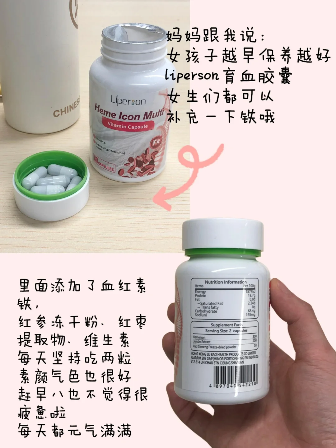 现在在看自己的照片,女孩子皮肤白净健康就很漂亮了,所以答应我!!经常熬夜、脸蛋黄气重的姐妹真的试试内调养肤!像我总熬夜➕不忌口,熬的脸色蜡黄,除了食补,做了功课入了liperson育血胶囊,里面有血红素铁,是可以直接吸收的二价铁,高浓度高吸收就是我保持水蜜桃皮肤的顶梁柱‼而且它里边还有十年红参做的冻干粉和红枣提取物、维生素,一瓶补充多种营养,吃到现在皮肤健康红润,幼态感直接拉满,室友控制不住想rua我!