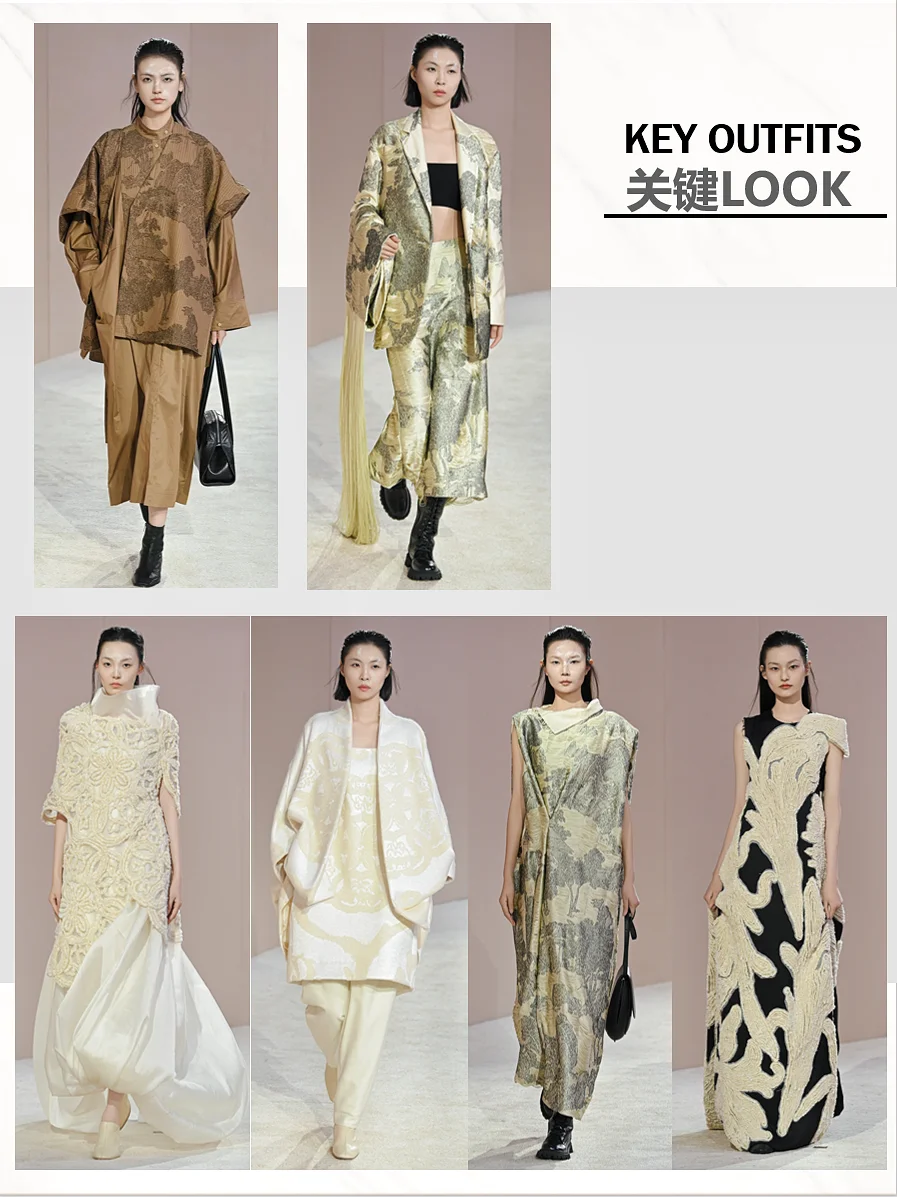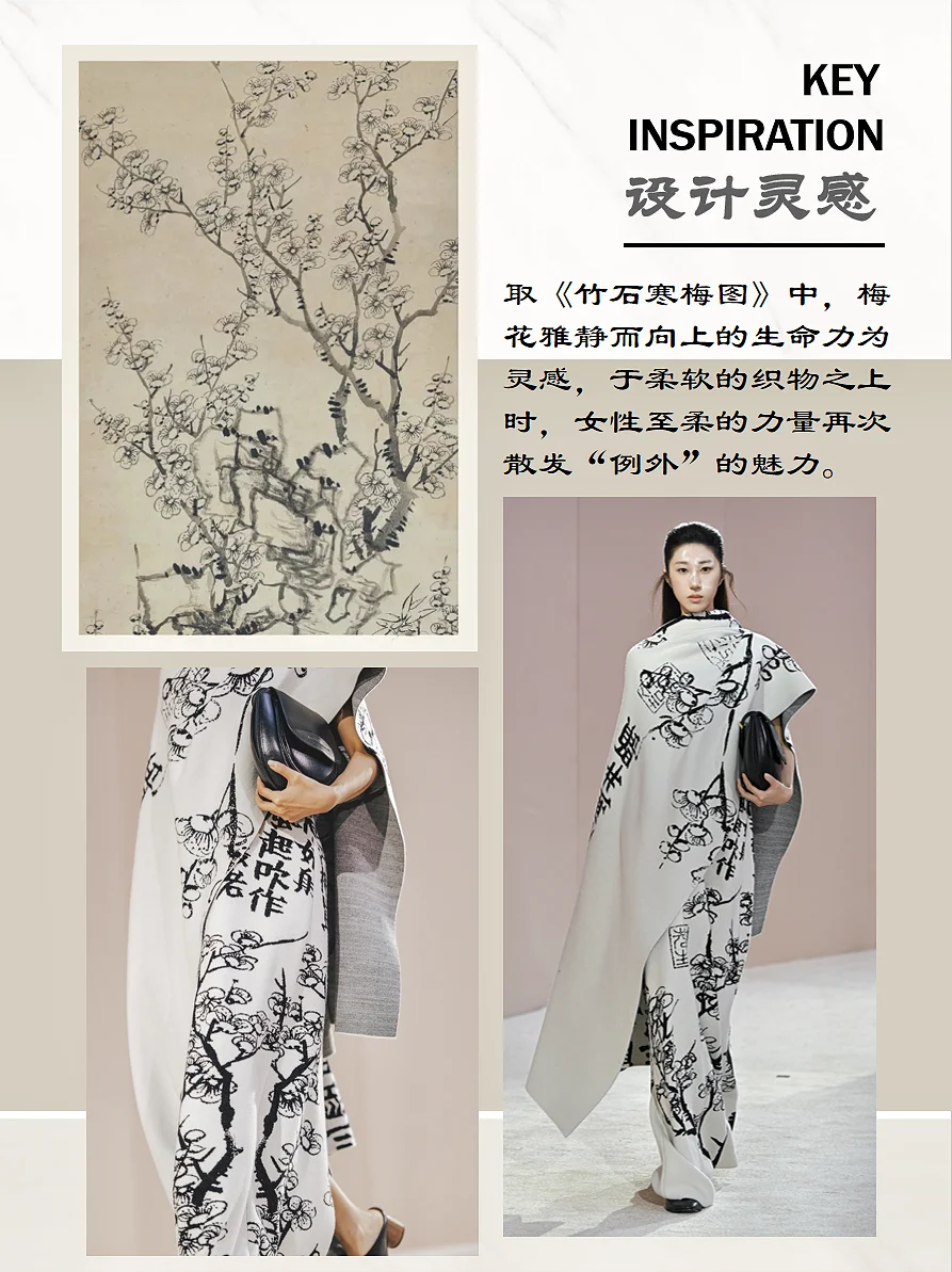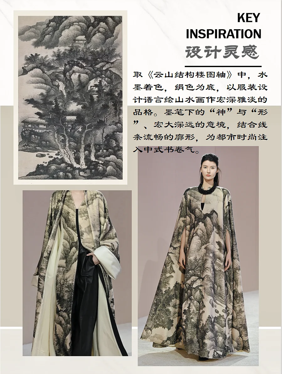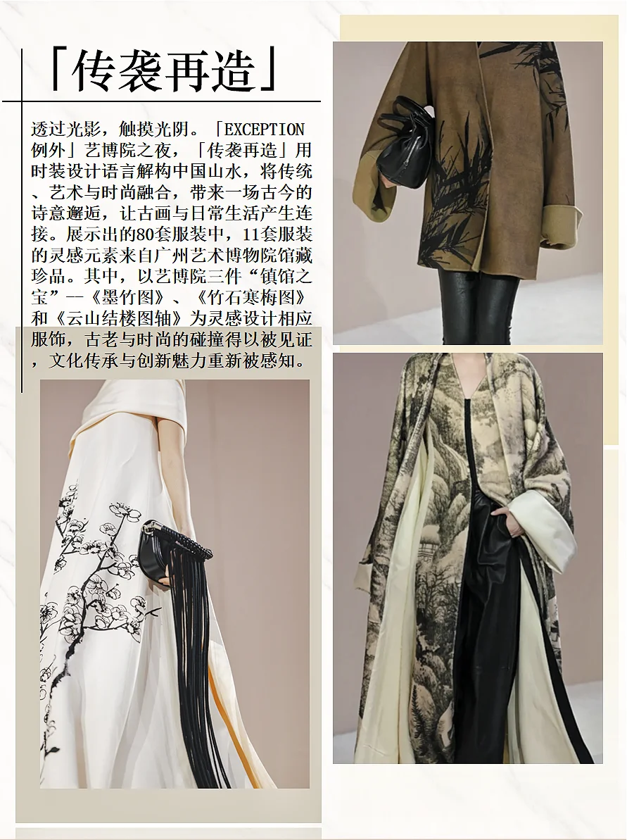 透过光影,触摸光阴。EXCEPTION 例外艺博院之夜, 「传袭再造」用时装设计语言解构中国山水,将传统、 艺术与时尚融合,带来一场古今的诗意邂逅,让古画与 日常生活产生连接。展示出的80套服装中,11套服装 的灵感元素来自广州艺术博物院馆藏珍品。其中,以艺 博院三件“镇馆之宝”--《墨竹图》、《竹石寒梅图》 和《云山结楼图轴》为灵感设计的相应服饰,古老与时 尚的碰撞得以被见证,文化传承与创新魅力的重新被感 知。这次秀场,EXCEPTION例外从中式美学的自然道 法意境中寻找适应的章法。贯穿整个系列的自然山水画 作,取黑、白、大地色系为主色,营造其宏深雅淡的品 格,再以匹印、绣花、印花错落叠加,推进服装层次, 墨笔下的“神”与“形”在针线的游走中现于服装之上 。极繁的工艺与极简的廓形,高级定制理念与中国传统 工艺,仪式感与日常化,在EXCEPTION 例外的设计语 言下融合,带来全新的风尚。