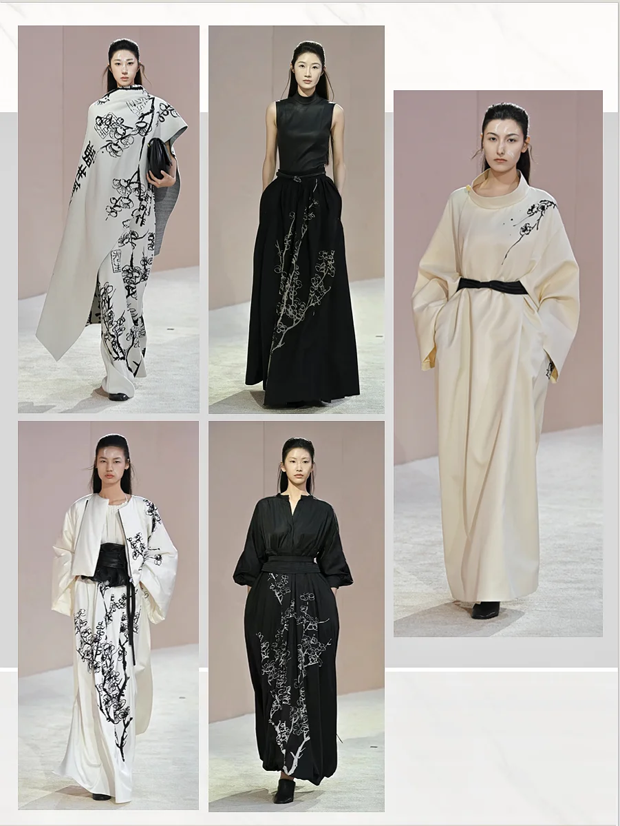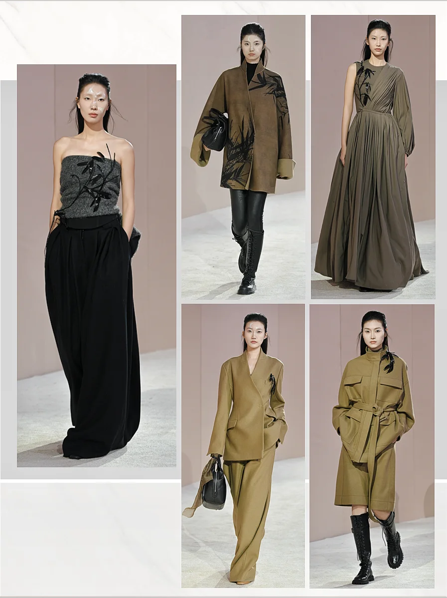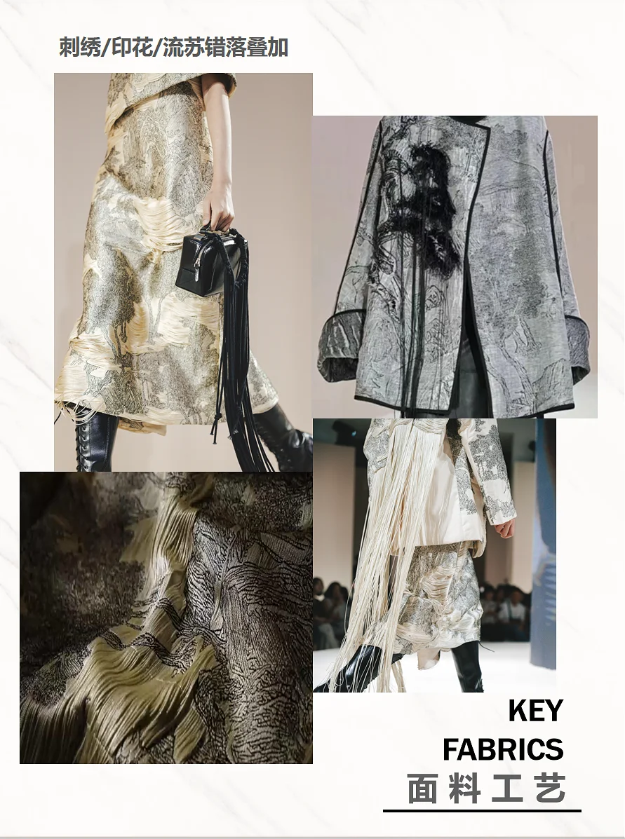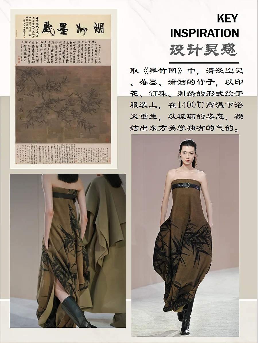 透过光影,触摸光阴。EXCEPTION 例外艺博院之夜, 「传袭再造」用时装设计语言解构中国山水,将传统、 艺术与时尚融合,带来一场古今的诗意邂逅,让古画与 日常生活产生连接。展示出的80套服装中,11套服装 的灵感元素来自广州艺术博物院馆藏珍品。其中,以艺 博院三件“镇馆之宝”--《墨竹图》、《竹石寒梅图》 和《云山结楼图轴》为灵感设计的相应服饰,古老与时 尚的碰撞得以被见证,文化传承与创新魅力的重新被感 知。这次秀场,EXCEPTION例外从中式美学的自然道 法意境中寻找适应的章法。贯穿整个系列的自然山水画 作,取黑、白、大地色系为主色,营造其宏深雅淡的品 格,再以匹印、绣花、印花错落叠加,推进服装层次, 墨笔下的“神”与“形”在针线的游走中现于服装之上 。极繁的工艺与极简的廓形,高级定制理念与中国传统 工艺,仪式感与日常化,在EXCEPTION 例外的设计语 言下融合,带来全新的风尚。