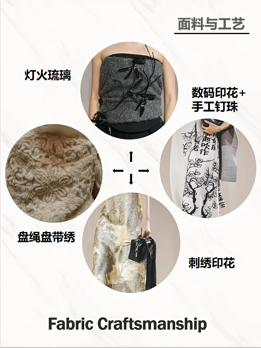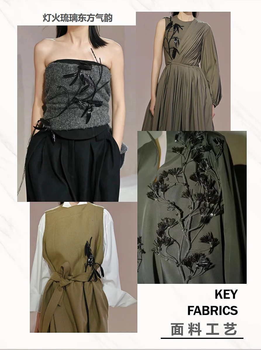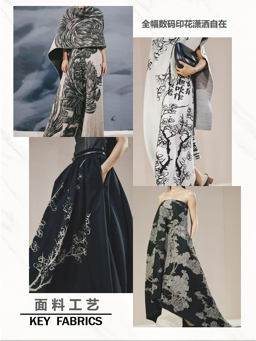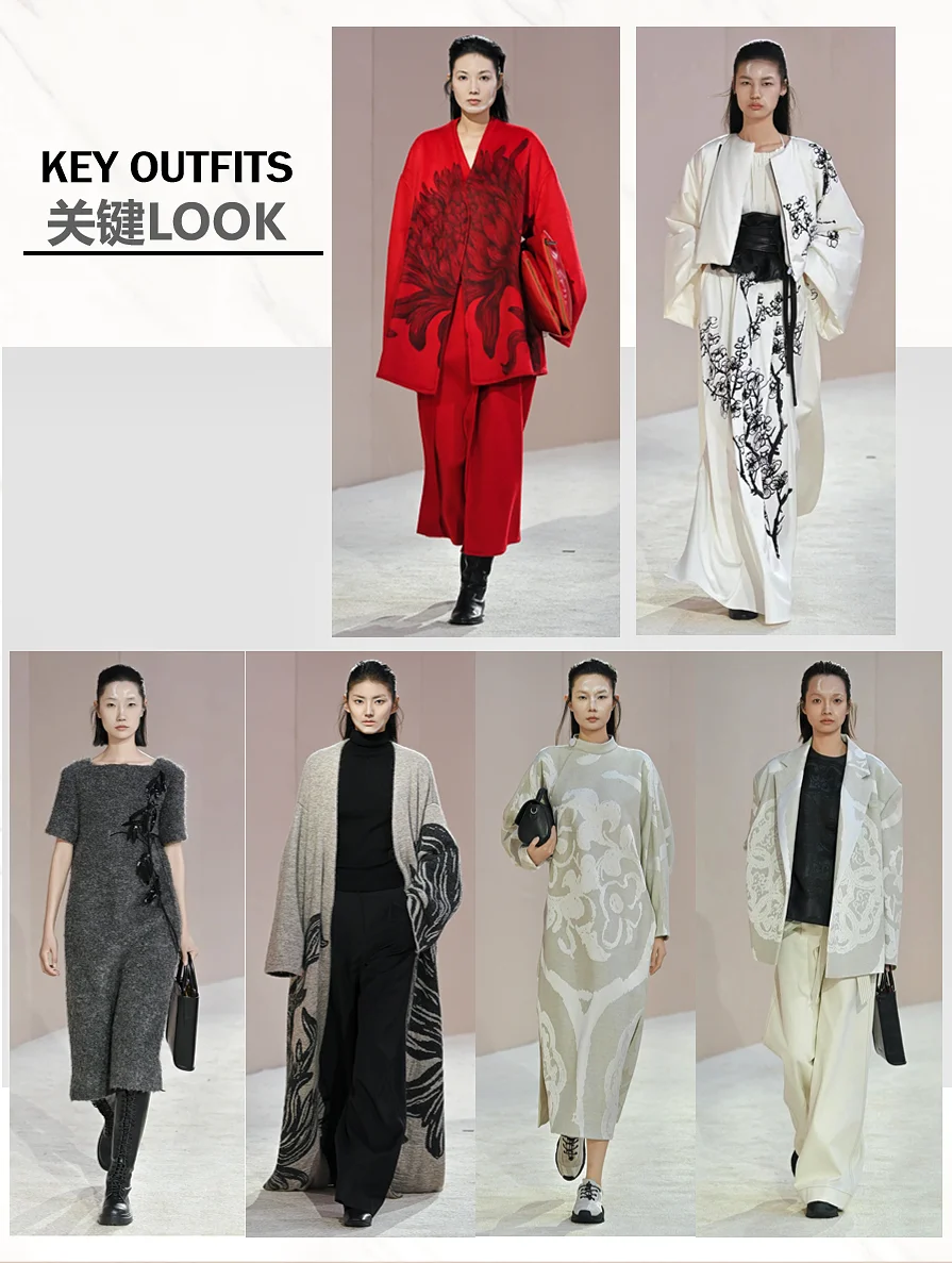 透过光影,触摸光阴。EXCEPTION 例外艺博院之夜, 「传袭再造」用时装设计语言解构中国山水,将传统、 艺术与时尚融合,带来一场古今的诗意邂逅,让古画与 日常生活产生连接。展示出的80套服装中,11套服装 的灵感元素来自广州艺术博物院馆藏珍品。其中,以艺 博院三件“镇馆之宝”--《墨竹图》、《竹石寒梅图》 和《云山结楼图轴》为灵感设计的相应服饰,古老与时 尚的碰撞得以被见证,文化传承与创新魅力的重新被感 知。这次秀场,EXCEPTION例外从中式美学的自然道 法意境中寻找适应的章法。贯穿整个系列的自然山水画 作,取黑、白、大地色系为主色,营造其宏深雅淡的品 格,再以匹印、绣花、印花错落叠加,推进服装层次, 墨笔下的“神”与“形”在针线的游走中现于服装之上 。极繁的工艺与极简的廓形,高级定制理念与中国传统 工艺,仪式感与日常化,在EXCEPTION 例外的设计语 言下融合,带来全新的风尚。