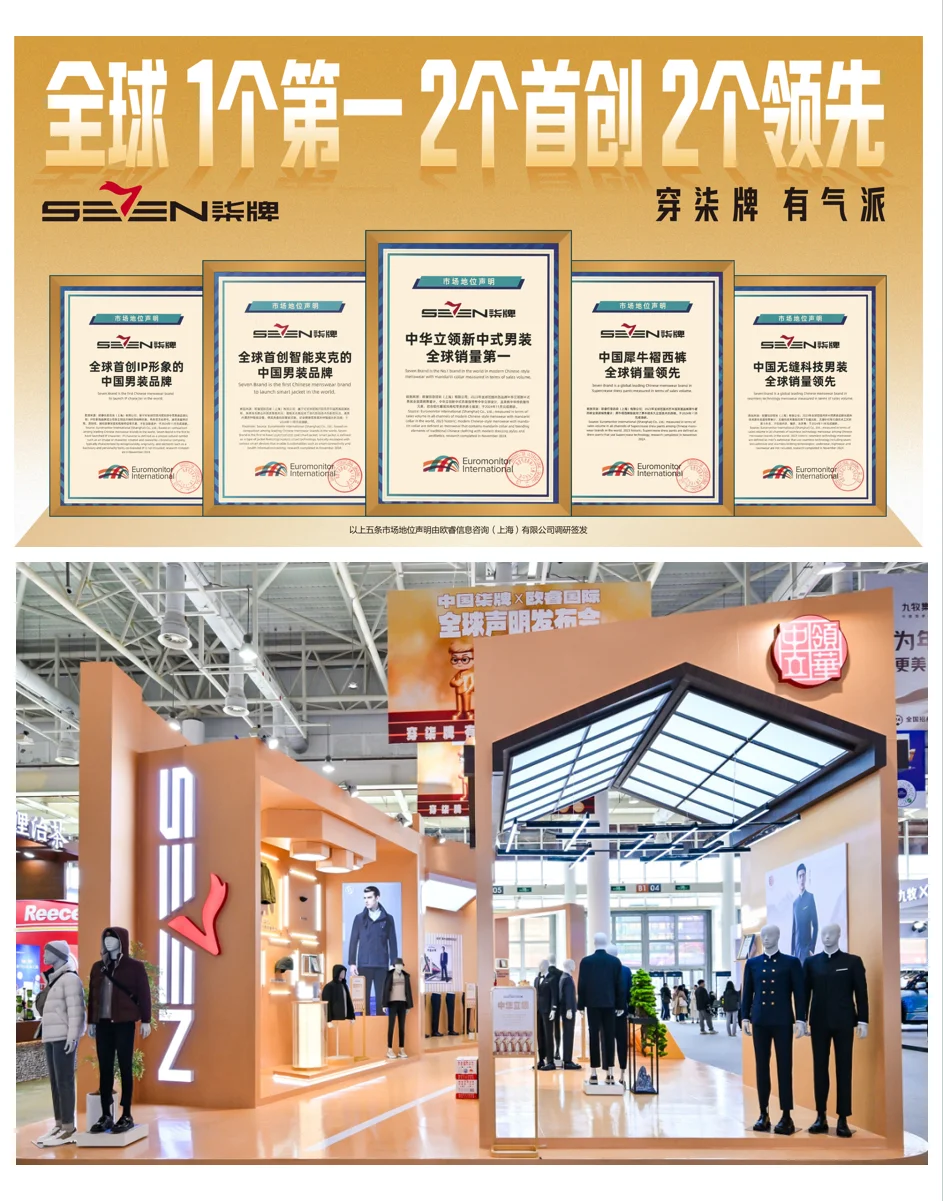 权威市场调查机构欧睿基于调研,向中国柒牌发布了“中华立领新中式男装全球销量第一”、“全球首创IP形象的中国男装品牌”、“全球首创智能夹克的中国男装品牌”、“中国无缝科技男装全球销量领先”、“中国犀牛褶西裤全球销量领先”共计五项声明。