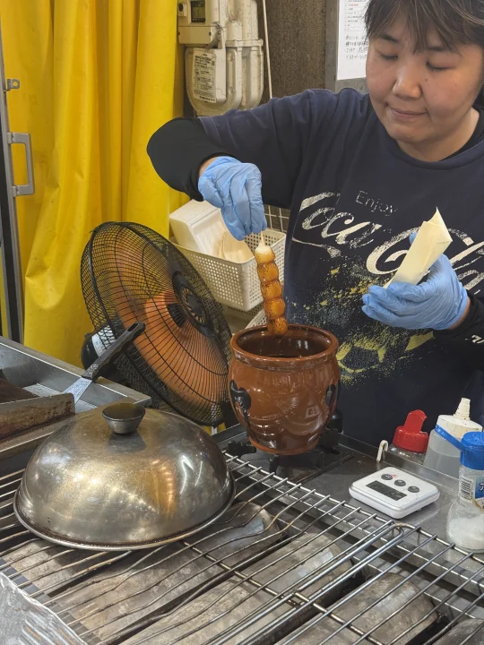 第二站黑门市场,从广告牌走路13分钟,定位:大阪市中央区日本桥2-4-1. ‼️千万不要在黑门吃‼️超级无敌贵量还巨少!打打卡就好!不过这家糯米丸子很好吃,后悔只买了一个.