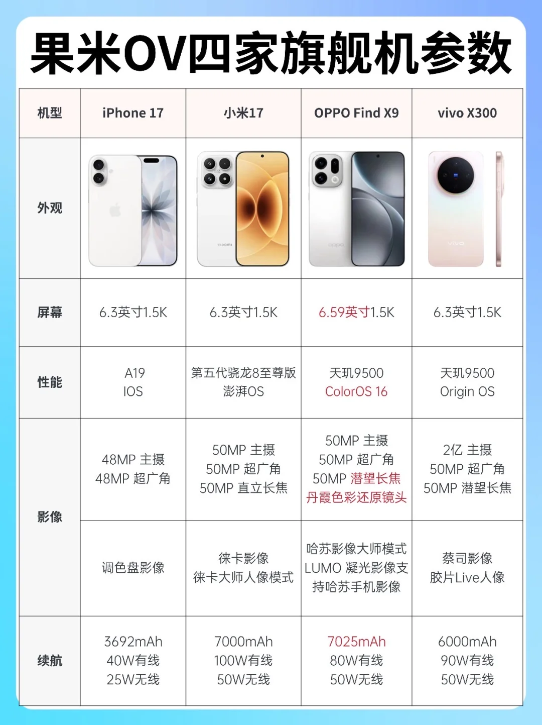 今年除了小米17没有对影像进行大幅升级依然是三枚5000万后置镜头外,其他三家都升级不小。iPhone17将超广角镜头提升到了4800万像素,但标准版依然没有独立长焦镜头,vivo X300给到了2亿像素主摄,还有蔡司影像和2K高清live。OPPO Find X9最夸张,把去年Ultra版本上的丹霞色彩还原镜头给放到了标准版上,再加上5000万像素的主摄、超广角和长焦镜头,硬件素质已经是顶尖水平了,更不要说还有4K超清live和哈苏影像大师,拍照超绝给力。