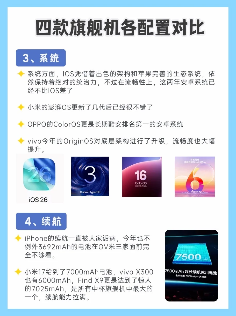 苹果的续航一直被大家诟病,3692mAh的电池在OV米三家面前完全不够看,小米给到了7000mAh电池,vivo 也有6000mAh,Find X9更是达到了惊人的7025mAh,是所有中杯旗舰机中最大的一个,续航能力拉满。