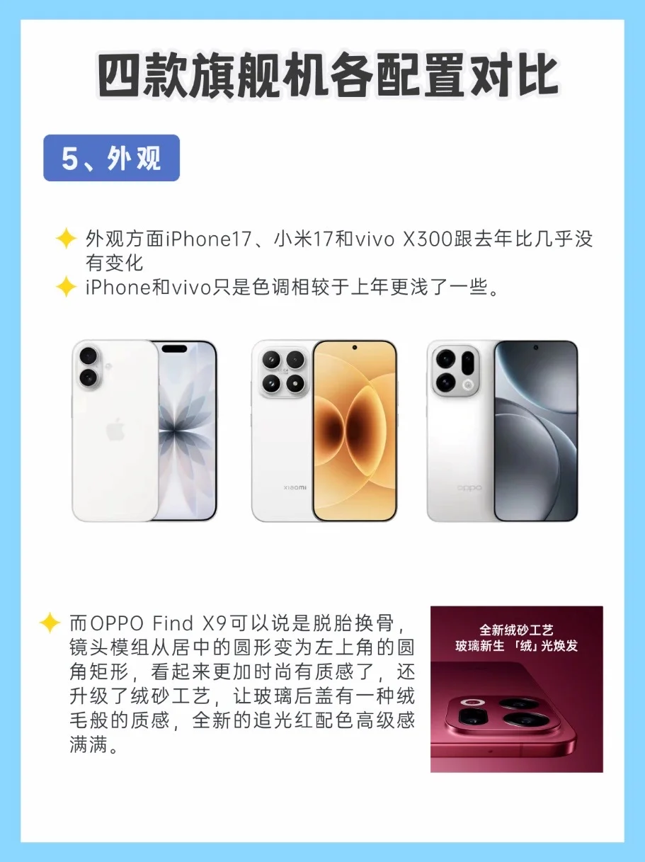 苹果、小米和vivo跟去年比几乎没有变化,苹果和vivo只是色调相较于上年更浅了一些。OPPO Find X9可以说是脱胎换骨,镜头模组从居中的圆形变为左上角的圆角矩形,看起来更加时尚有质感了,升级了绒砂工艺,让玻璃后盖有一种绒毛般的质感。