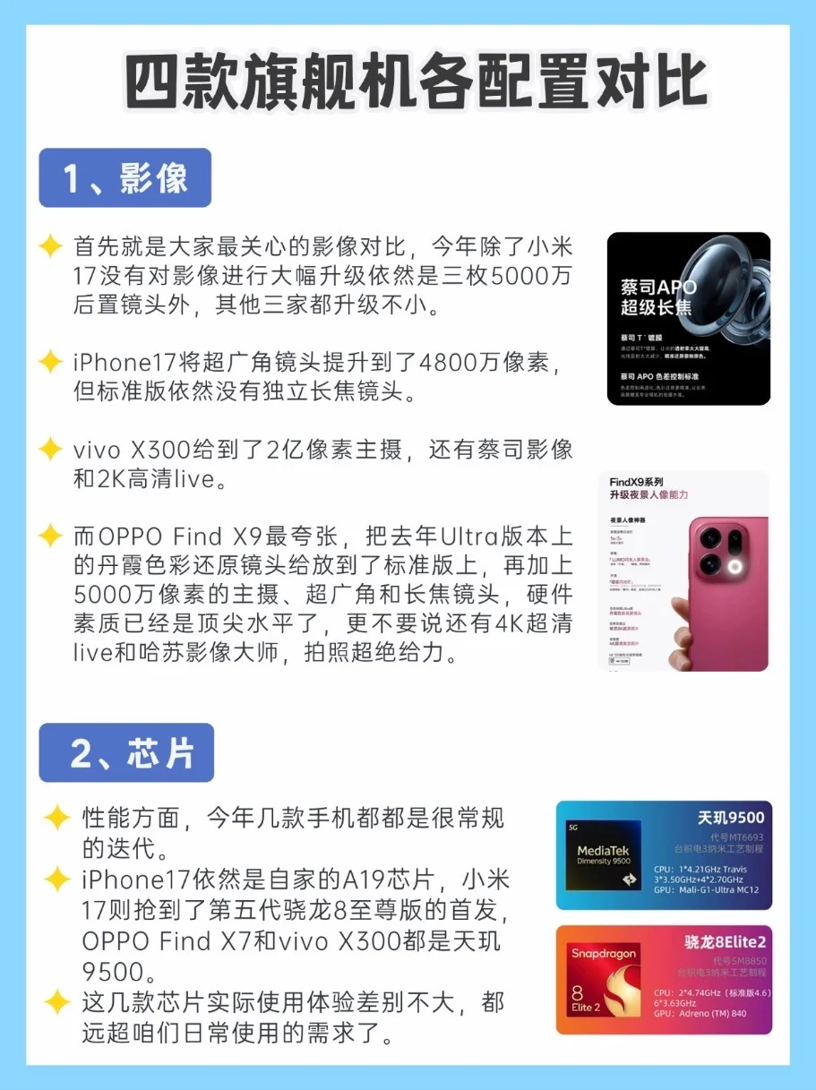 苹果依然是A19芯片,小米抢到了第五代骁龙8至尊版的首发,OPPO和vivo 都是天玑9500。这几款芯片实际使用体验差别不大,都远超咱们日常使用的需求